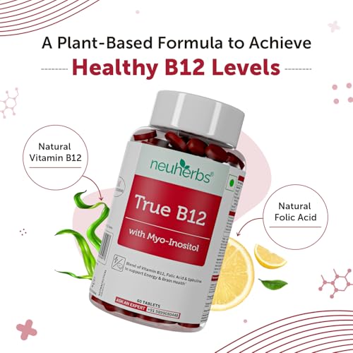 Neuherbs Plant-Based True B12 Supplements For Men & Women- 60 Tablets | B12 Tablets with Myo-inositol, Vitamin B9 (Folic Acid) & Spirulina | Vegetarian tablets for Energy, Brain Health, Digestion & Nerve Health |Supports Glowing Skin