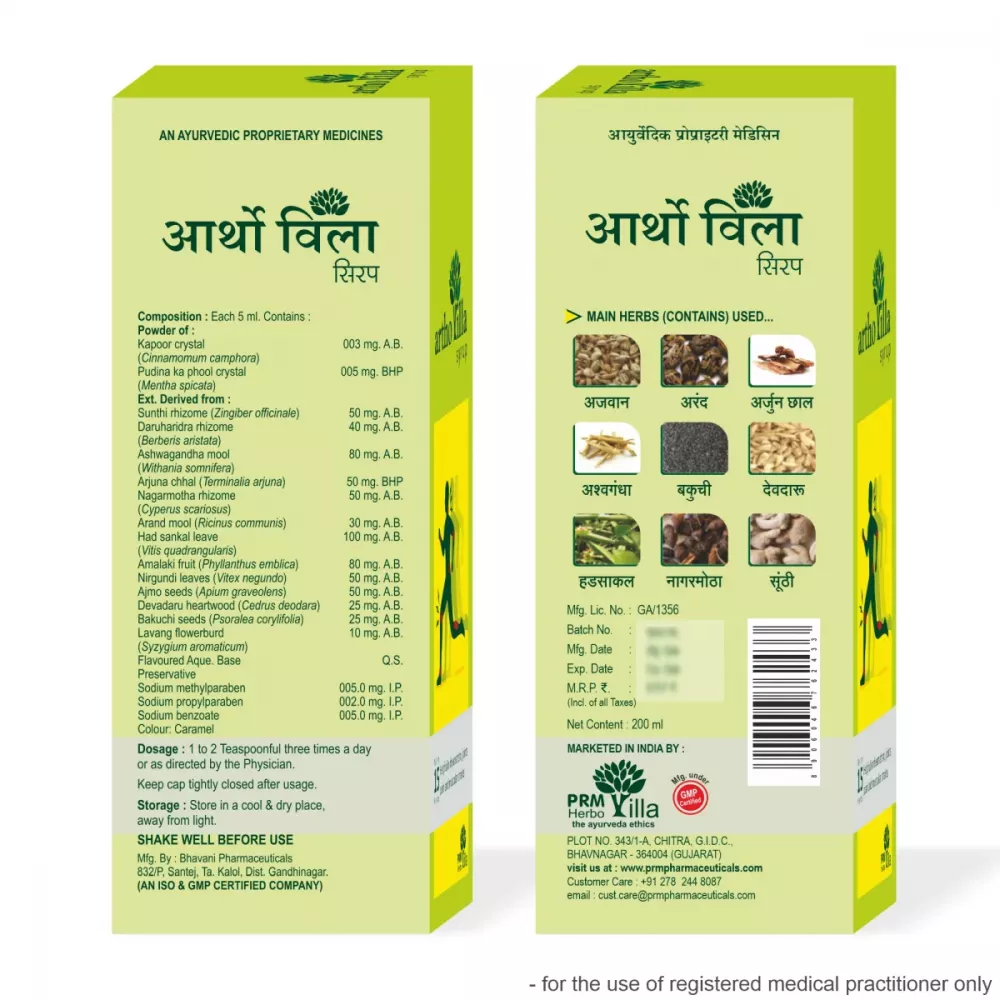 PRM Artho Villa Ayurvedic Arthritis Syrup 200ml (Pack of 2) Relieves Joint Stiffness & Inflammation with Hadsakal, Daruharidra & Sunthi