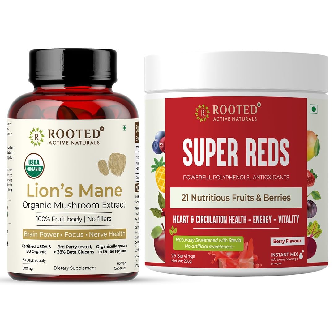 Rooted Active Naturals Super Reds Powder + Lion Mane Capsules (60 Caps) | Plant-Based & Mushroom Extract Formula