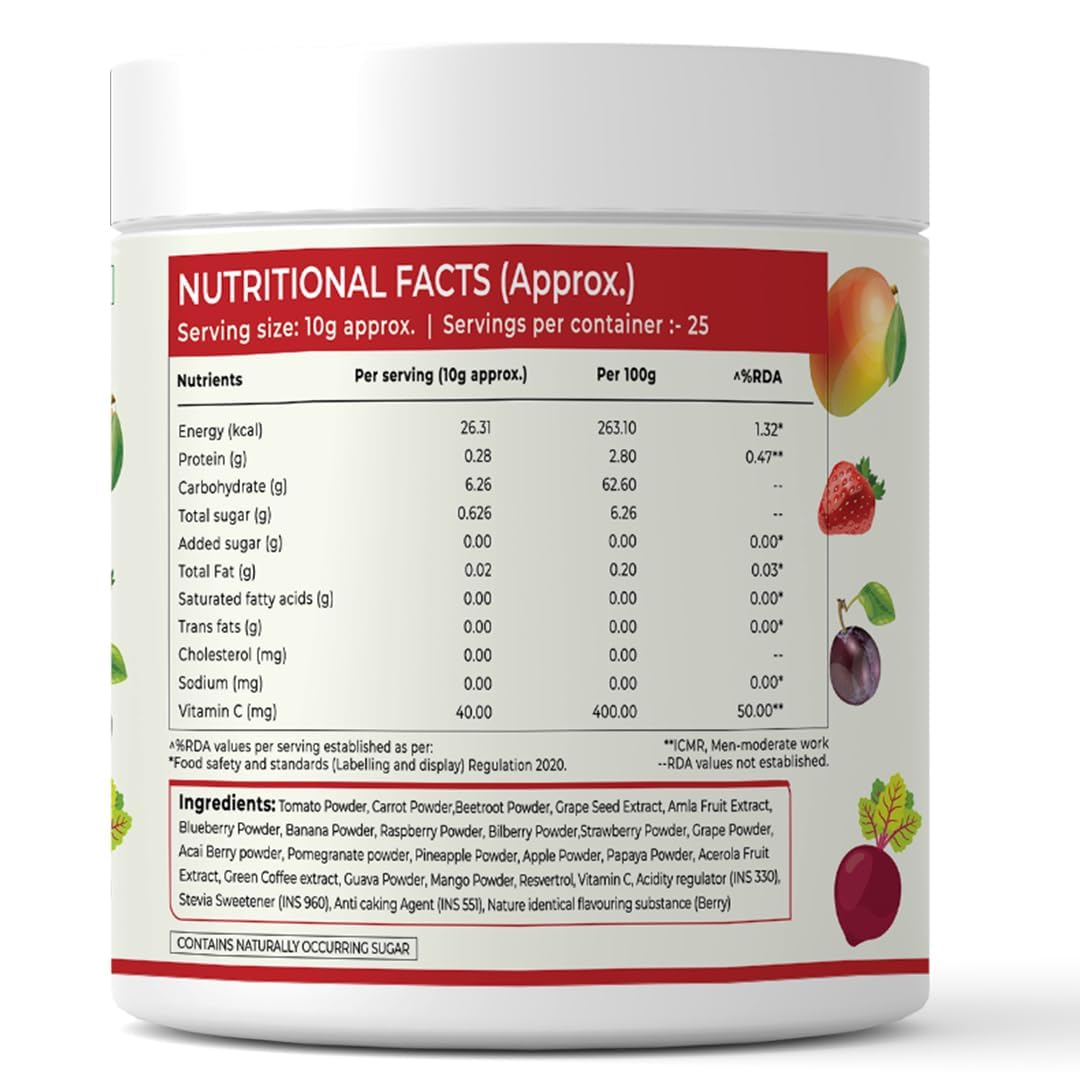 Plant-Based Formula Super Reds Powder includes a mix of fruit and vegetable extracts.