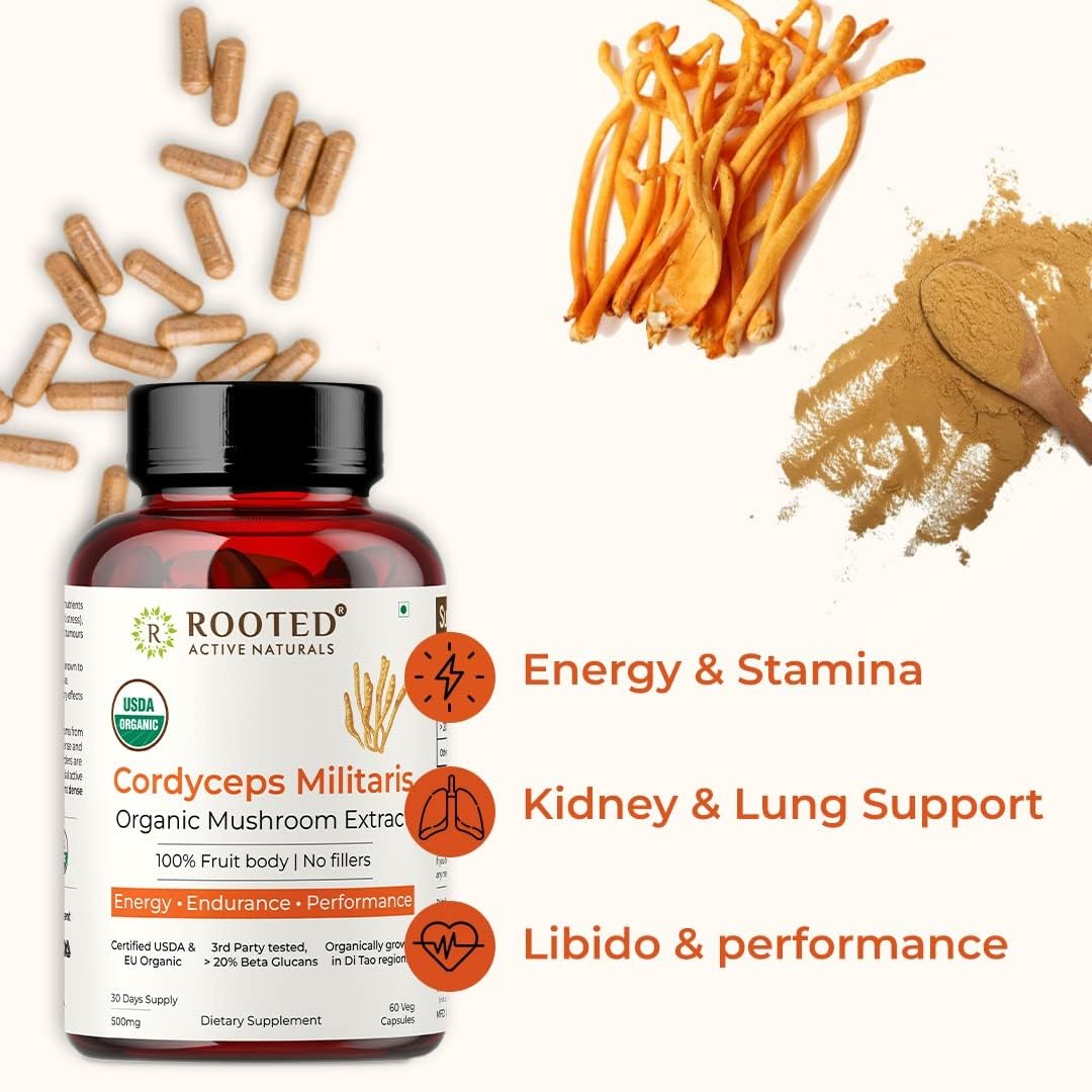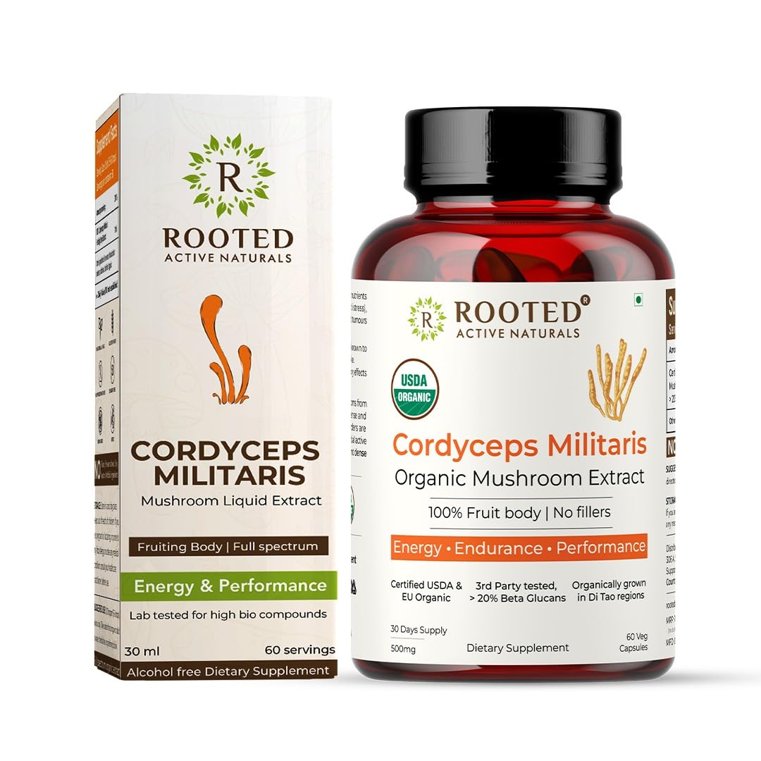 Rooted Active's Cordyceps Mushroom Capsules & Tincture | Dual-Action Supplement for Stamina Energy & Endurance | 100% Fruiting Body Extract | No Fillers Vegan & Non-GMO