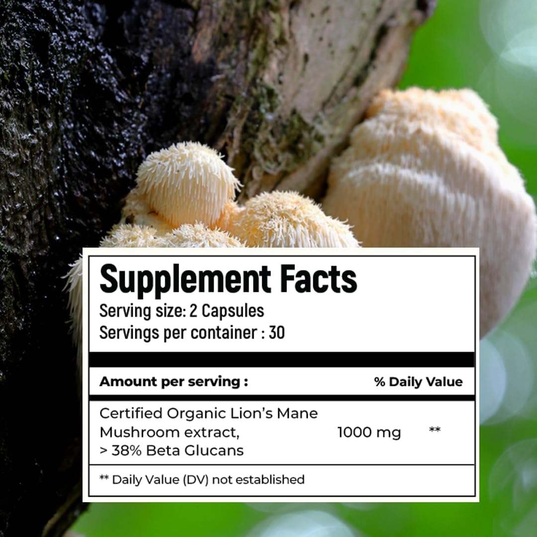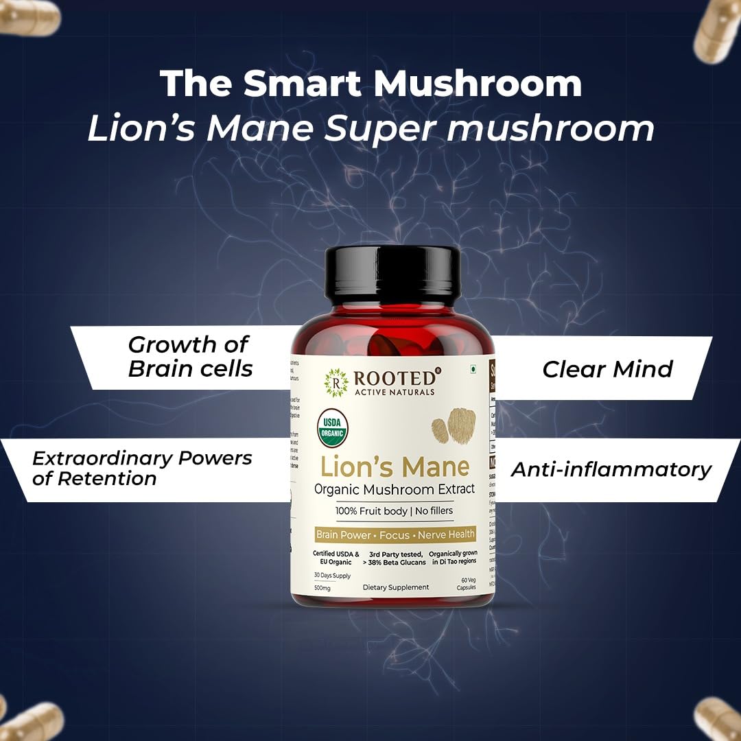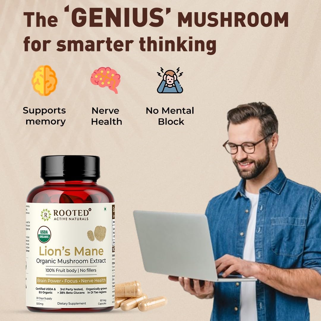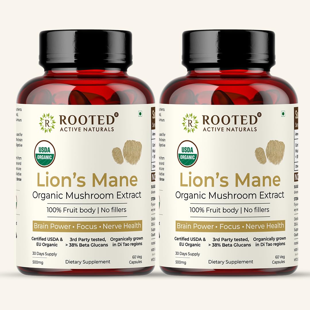 Rooted Active's Lion Mane Mushroom Capsules | Brain & Nerve Support | Natural Nootropic for Mental Clarity & Focus | Vegan Non-GMO Gluten-Free | 100% Fruiting Body Extract (Pack of 2) | 60 Caps