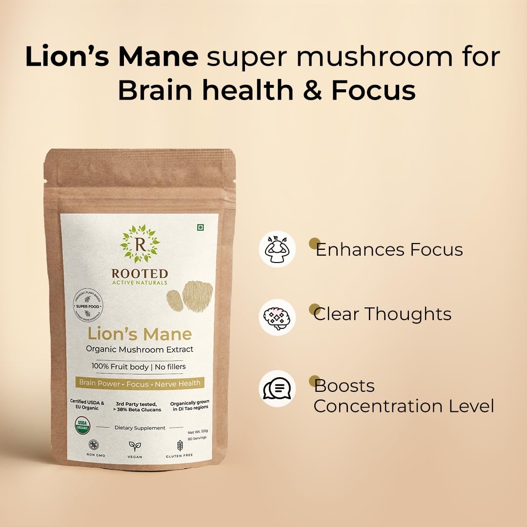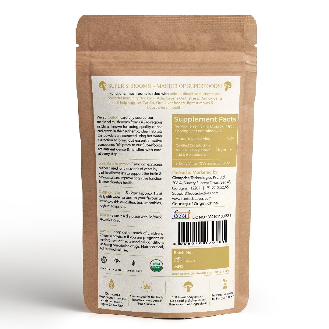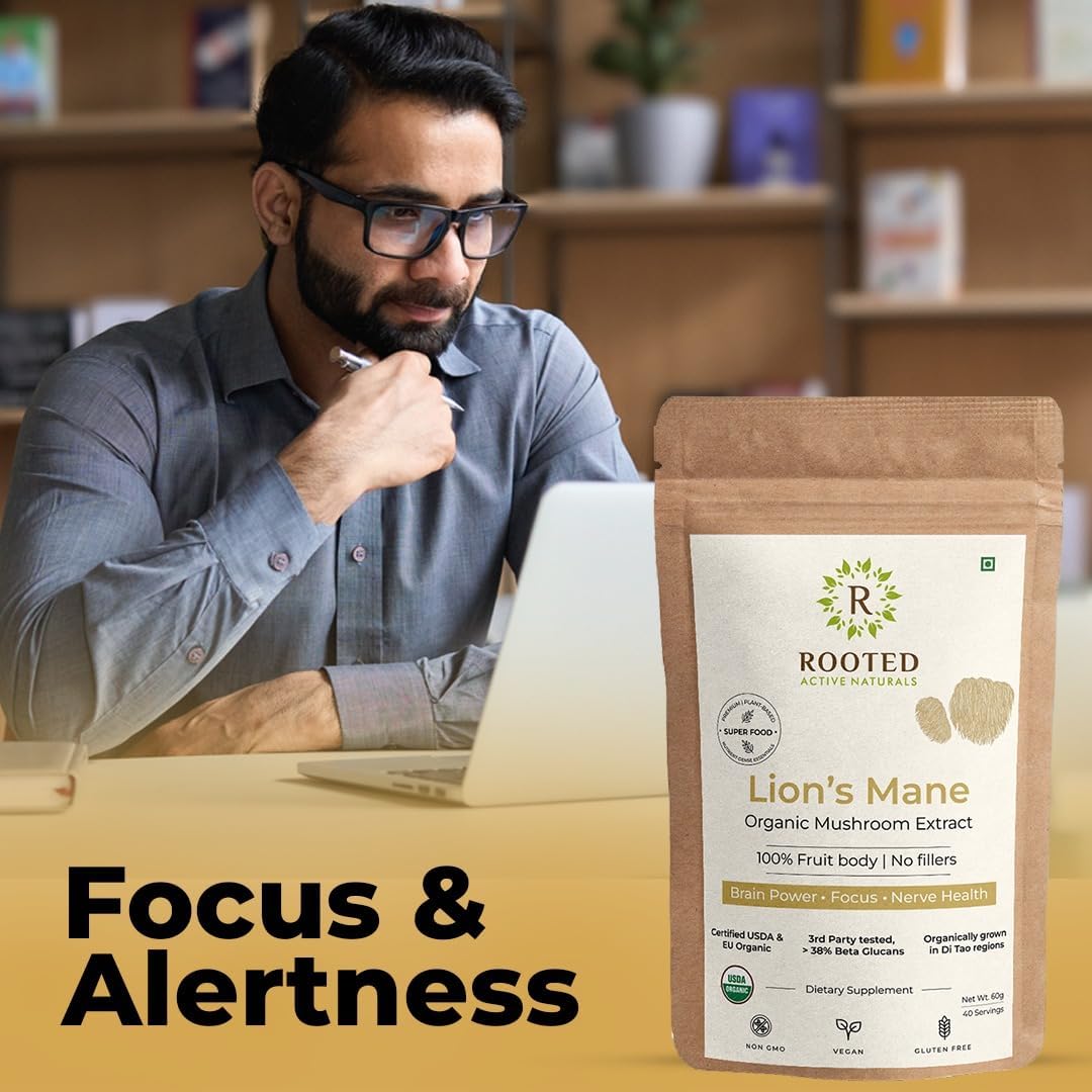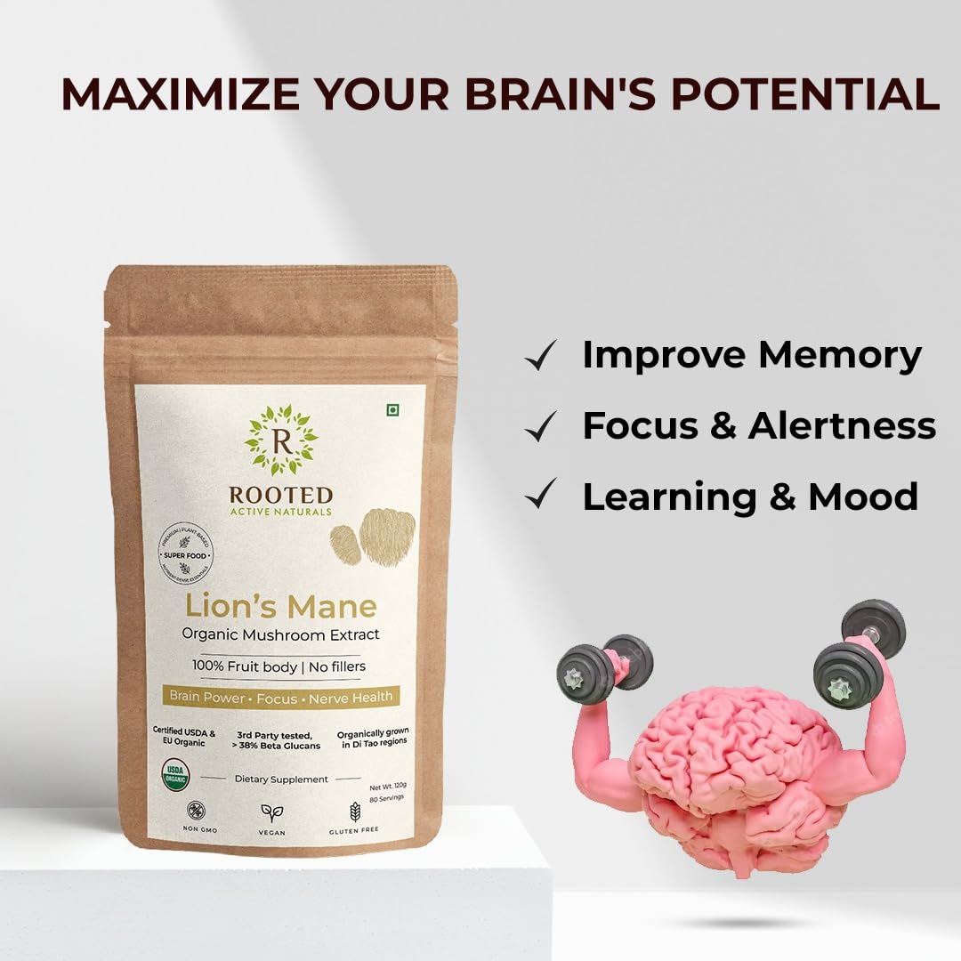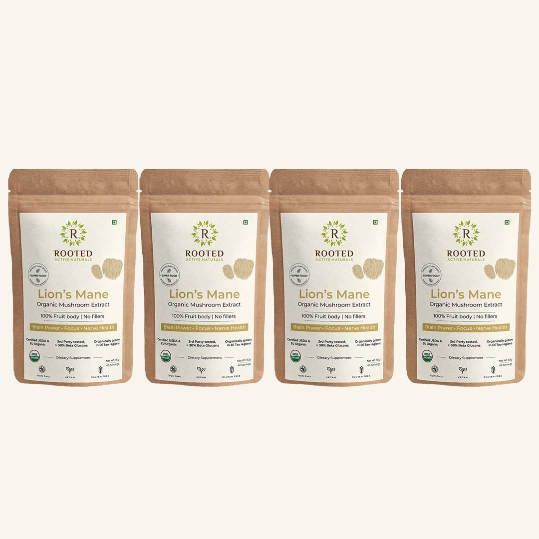 Rooted Active's Lion Mane Mushroom Powder | 100% Pure Mushroom Powder | No Artificial Additives | Non-GMO Vegan Gluten-Free | For Coffee Smoothies & Recipes | Pack of 4 | 60 Grams