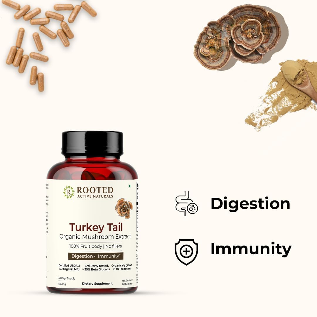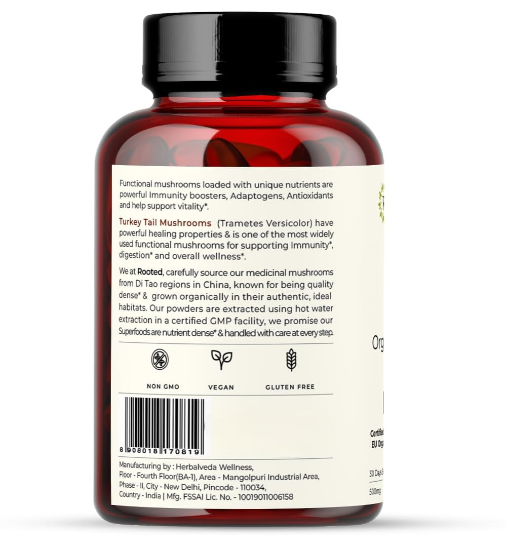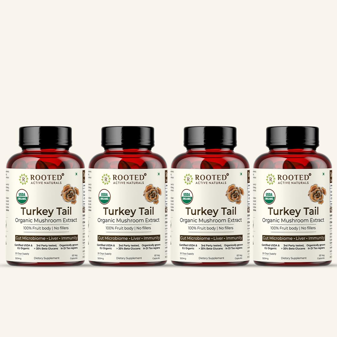 Rooted Active's Turkey Tail Mushroom Capsules | Whole Mushroom Powder | No Fillers or Additives | Non-GMO Vegan & Gluten-Free | Convenient Daily Supplement | Pack of 4 | 60 Caps