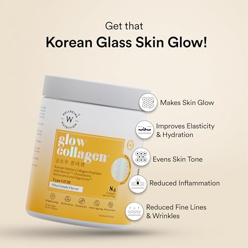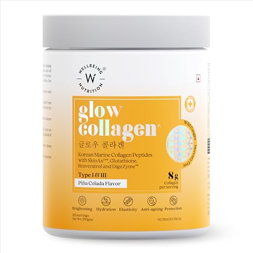 Wellbeing Nutrition Glow Korean Marine Collagen Skin Radiance Peptide 8g | Active Glutathione, Vitamin C, E, Resveratrol | Reduce Pigmentation, Dark Spots & Brighten Skin Tone | Pina Colada, 250gms