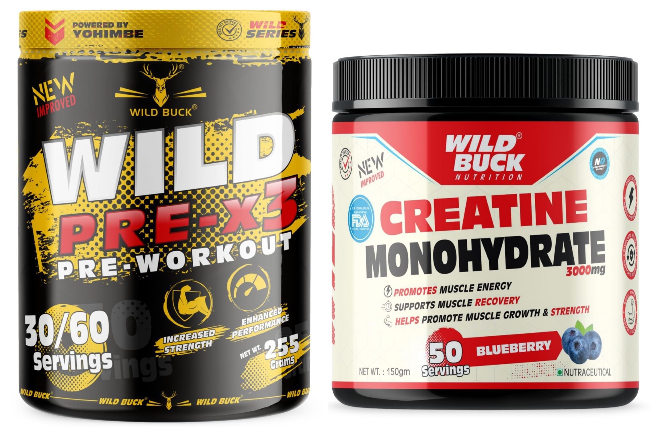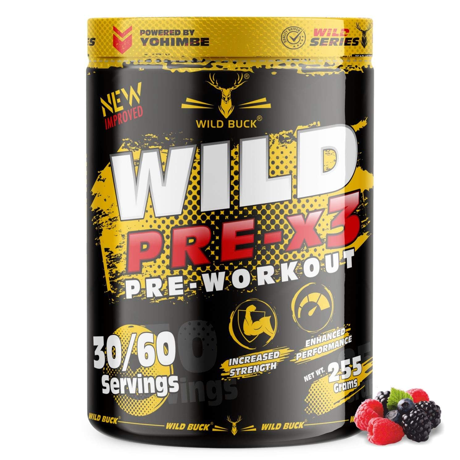 WILD BUCK Wild Pre-X3 Hardcore Pre-Workout Supplement powder Energy Drink with Creatine Monohydrate Arginine AAKG Beta-Alanine - For MenWomen [30-60 Servings Wild Berries 255g] + WILD BUCK Creatine Monohydrate Powder Strength Reduce Fatigue 100% Pure Crea