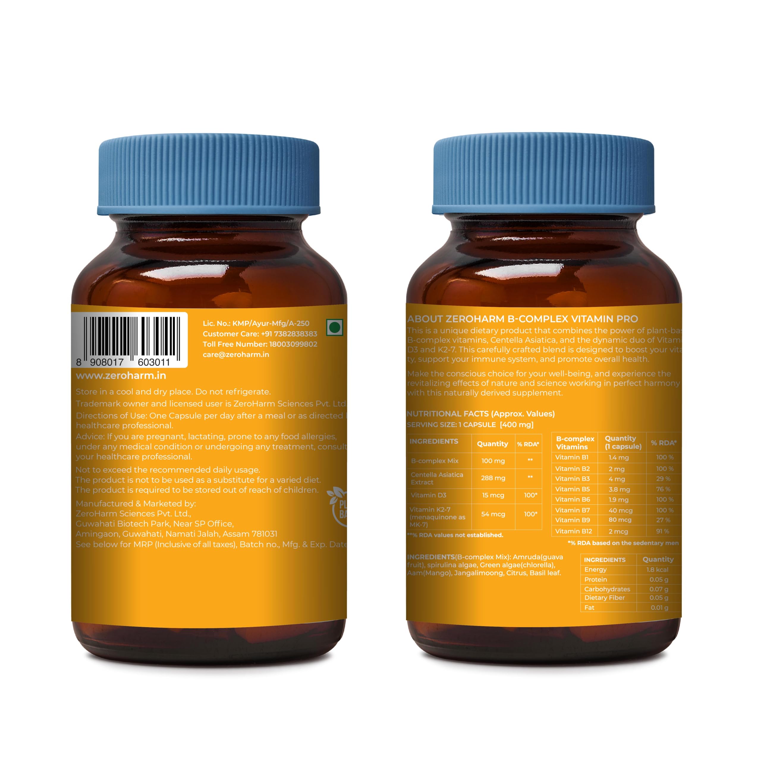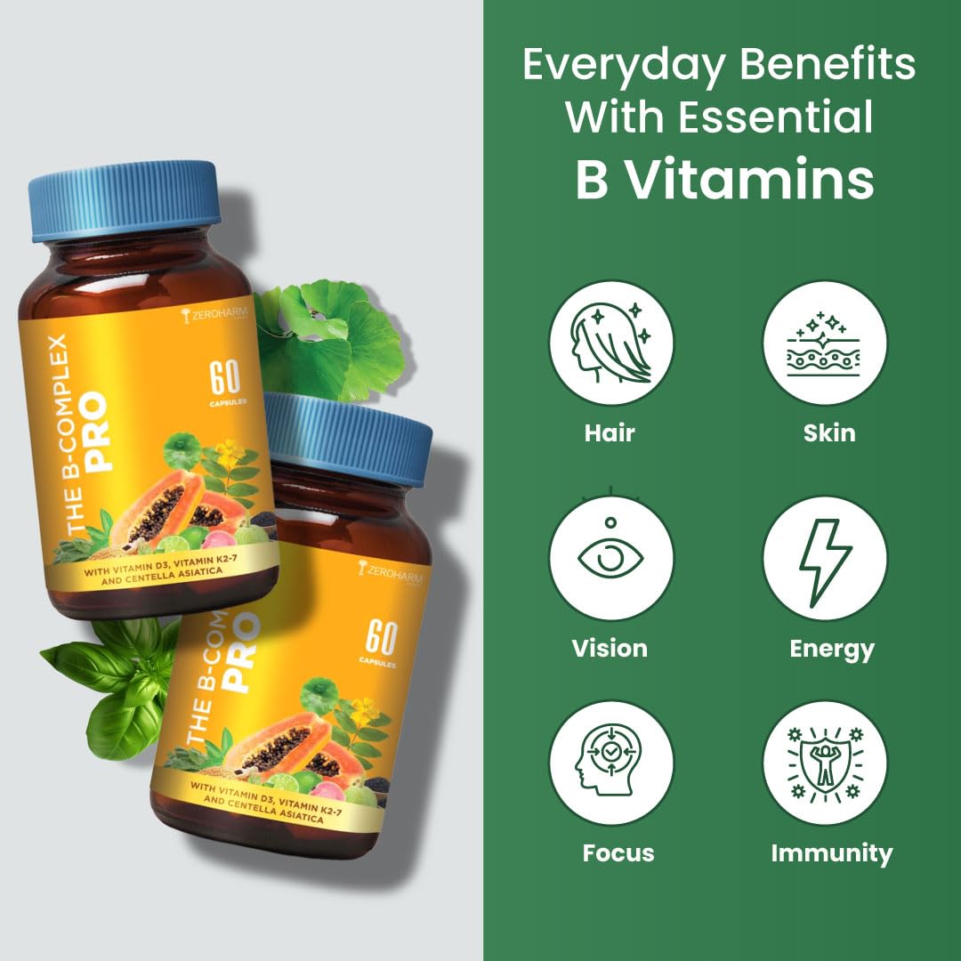 HomeHealth & PersonalDiet & NutritionHealth SupplementsZeroharm B-Complex Pro with Vitamin D3 & K2-7 | Vitamin B-Complex With B1 B2 B3 B5 B6 B9 & Vit B12 | Plant-Based Supplement | Supports Energy & Immunity For Men and Women | 60 Veg Capsules