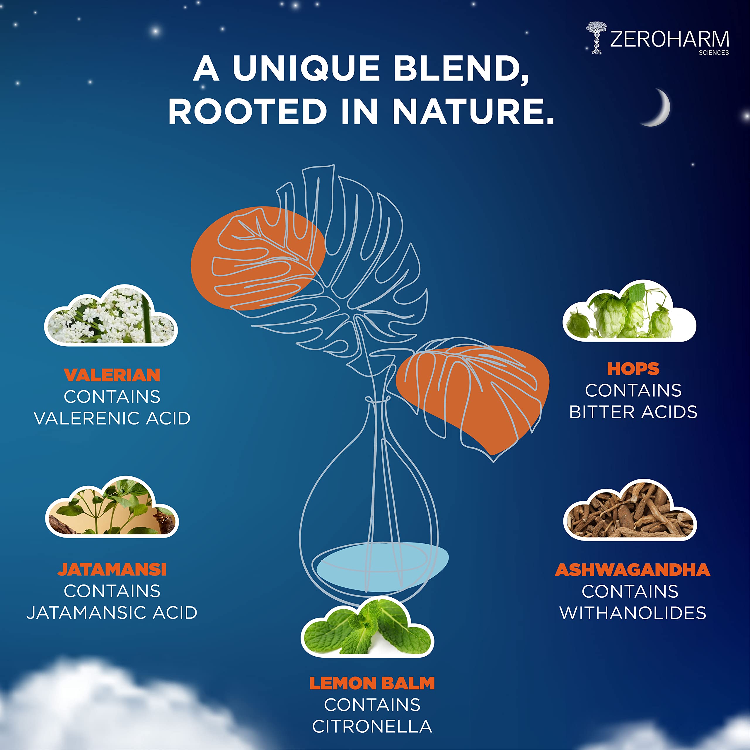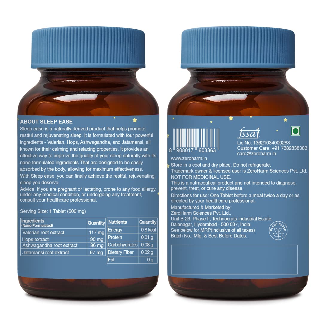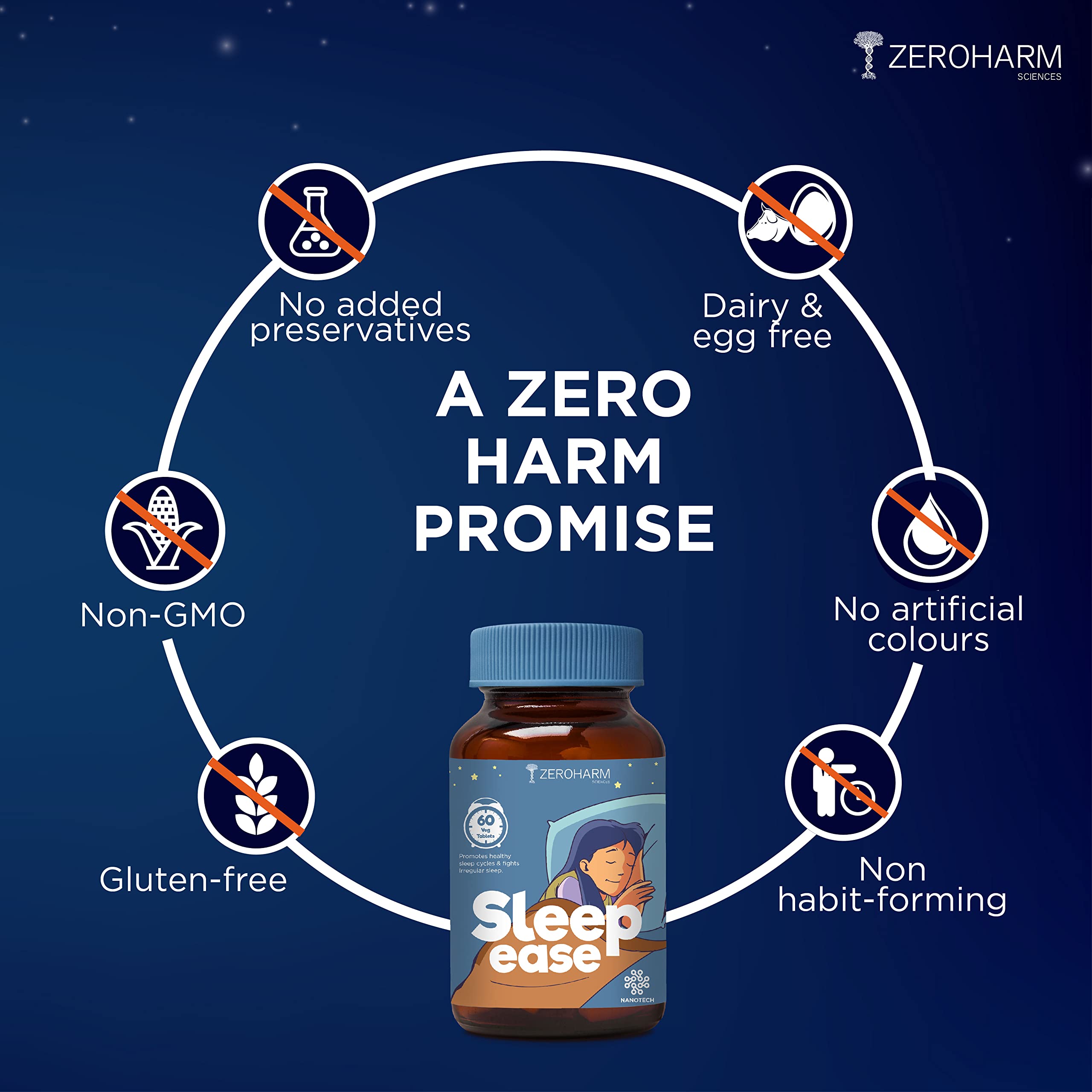 ZEROHARM SLEEP EASE. SLEEP TIGHT AND FEEL RIGHT. ZeroHarm Sleep Ease is a plant-based science-backed sleep supplement. Powered with the goodness of Valerian Hops Ashwagandha Lemon balm & Jatamansi to help you fall asleep naturally prevent restlessness & v