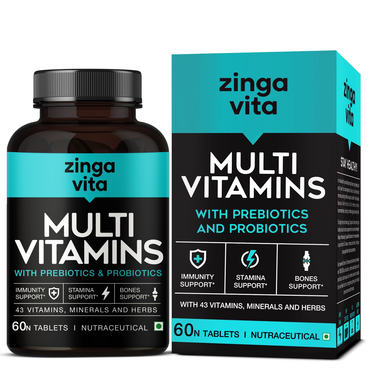 HomeHealth & PersonalDiet & NutritionHealth SupplementsZingavita Probiotics & Prebiotics Multivitamin Tablets with 43 Essential MineralsVitamins C D Zinc & Biotin for Better Immunity & Joint Support for Men & Women - 60 Tablets