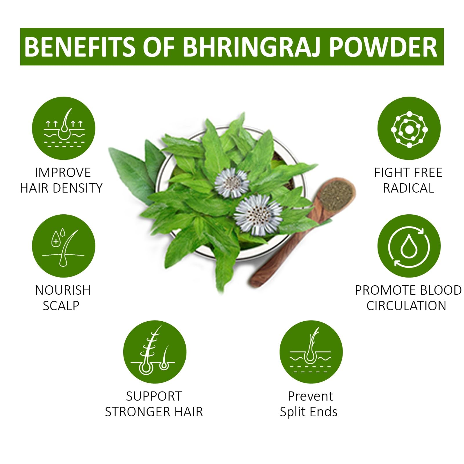 Prevents Hair Fall: Regular use of Bhringraj powder strengthen the roots of your hair thereby reducing hair fall. It nourishes the scalp and roots making your hair stronger and less prone to breakage.