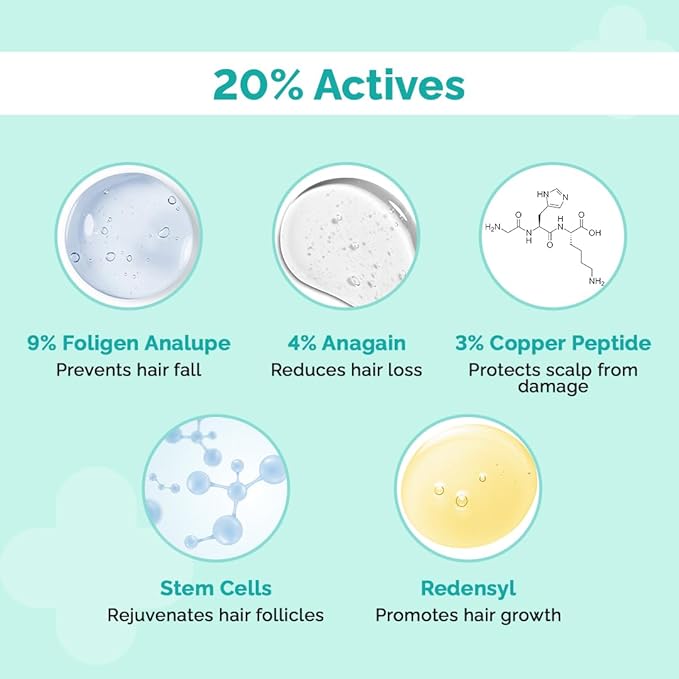 BOOSTS HAIR GROWTH: If youre experiencing sparse hairline, this serum is perfect for you. The perfect blend of Foligen Analupe, Anagain, Redensyl, and Copper Peptide add much-needed nourishment from roots to tips, resulting in healthy hair growth!