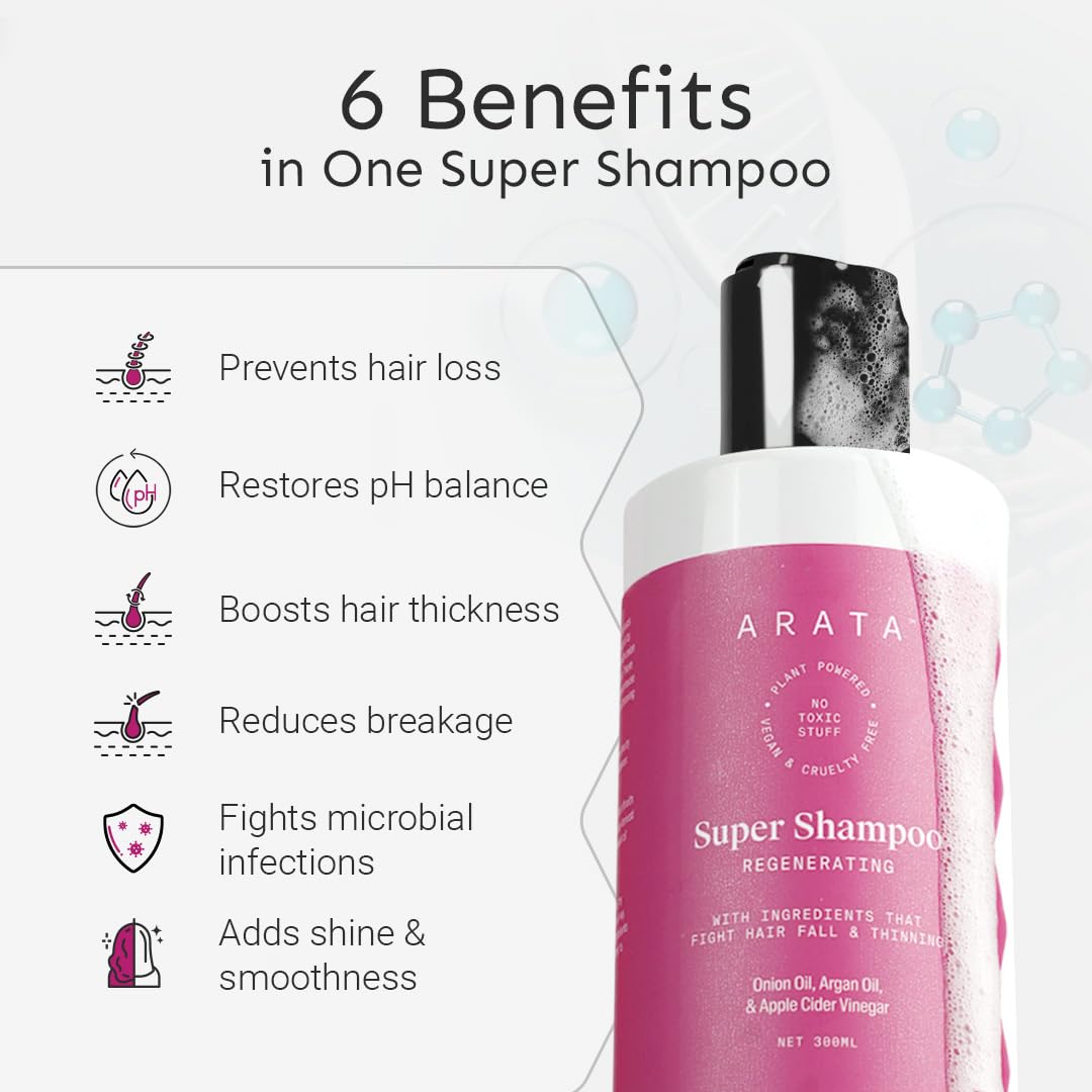 Arata 6-in-1 Super Shampoo | Prevents Hair loss | Restores pH Balance | Boosts Hair Thickness | Reduces Breakage | Fights Microbial Infections | Adds Shine | Shampoo For Women & Men | 300 ml