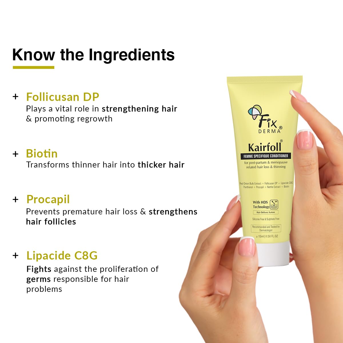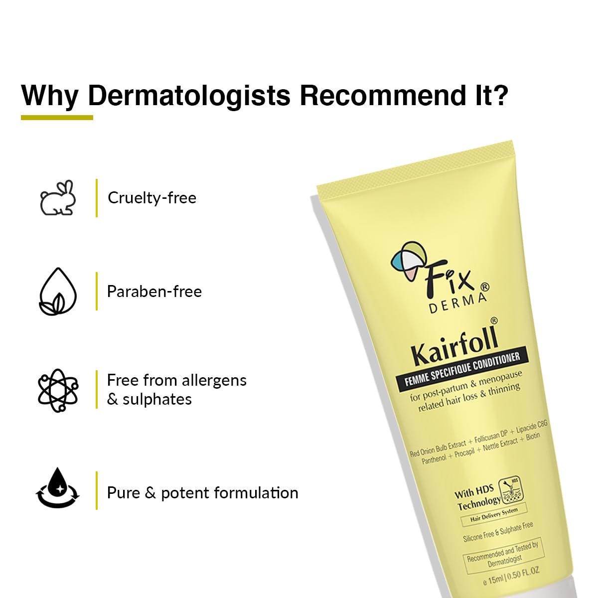 HomeHealth & PersonalHair CareOrganic Shampoos & ConditionersFixderma Kairfoll Femme Specifique Conditioner for Post-Partum & Menopause Related Hair Loss | Red Onion Conditioner with Castor Oil for Hair Growth | Conditioner for Women | Hair Conditioner - 15 ml