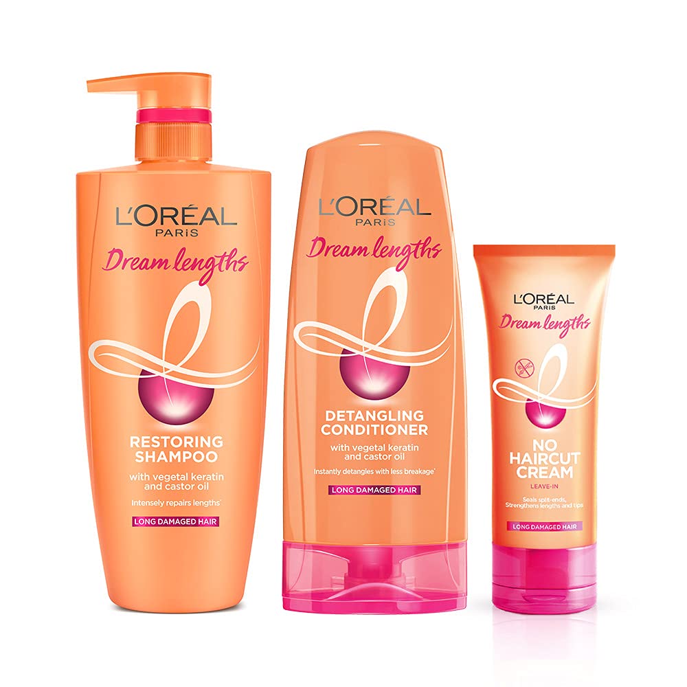 Loreal Paris Dream Lengths Long Hair Dreams Kit (With Restoring Shampoo 704ml + Detangling Conditioner 192.5ml + No haircut Cream Leave In Conditioner 50ml) 946.5ml