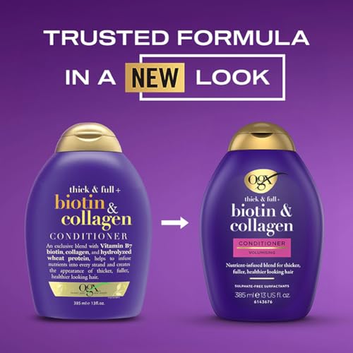 OGX Thick & Full Biotin & Collagen Volumizing Conditioner | Vitamin B7, Collagen & Hydrolyzed Wheat Protein, For Thicker, Fuller, Healthier looking hair, Sulfate Parabens Free 385 ml