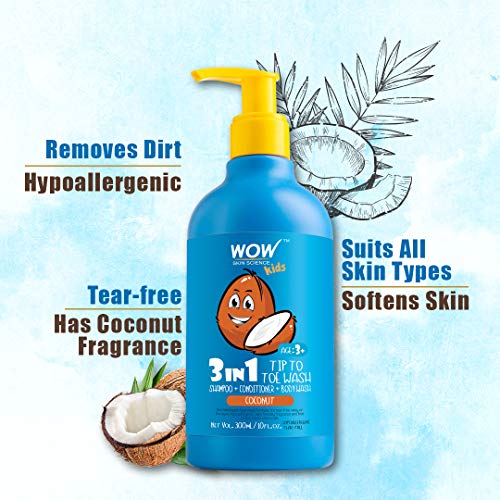 WOW Skin Science Kids Tip To Toe Wash - Shampoo - Conditioner - Body Wash - No Sulphates & Parabens - Coconut, 300 ml