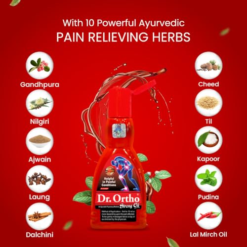 The goodness of 10 herbs- Dr. Ortho Strong Ayurvedic pain relief Oil is a blend of- Gandhpura Oil Nilgiri Oil Ajwain Oil Lavang Oil Dalchini Oil Lal Mirch Oil Cheed oil Til oil Kapoor Pudina a complete muscle and joint pain relief. All the ingredients hav