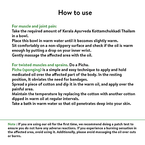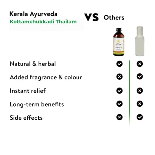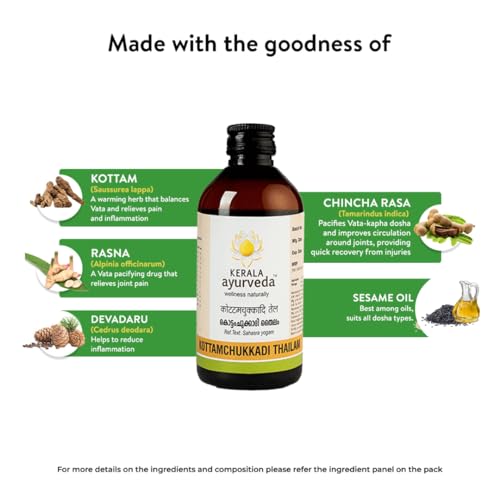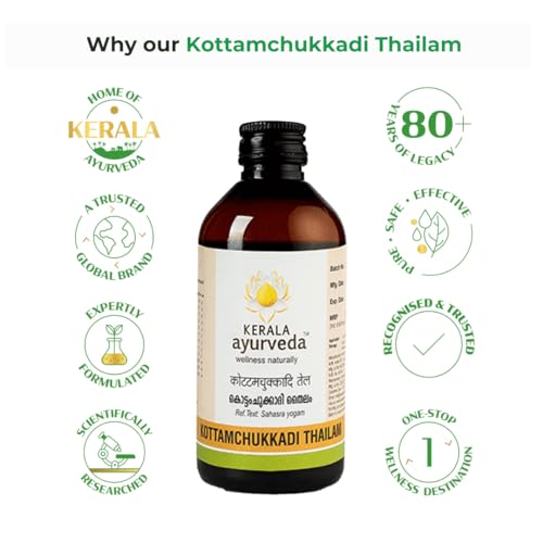 Original recipe with authentic herbs- Kerala Ayurveda Kottamchukkadi Thailam is based on an original classical Ayurvedic recipe that has been used for thousands of years to support the muscles tendons and joints of elbow and neck making this herbal oil es