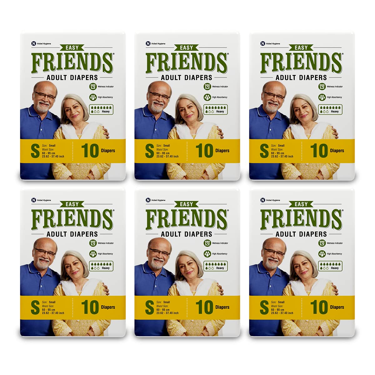 Friends Easy Adult Diapers Tape Style - 60 Count (Small) with odour lock, Unisex, Leakproof, Wetness Indicator and Anti-Bacterial Absorbent Core- Waist Size 22.44-39.37 inch; 57-100 cm