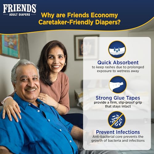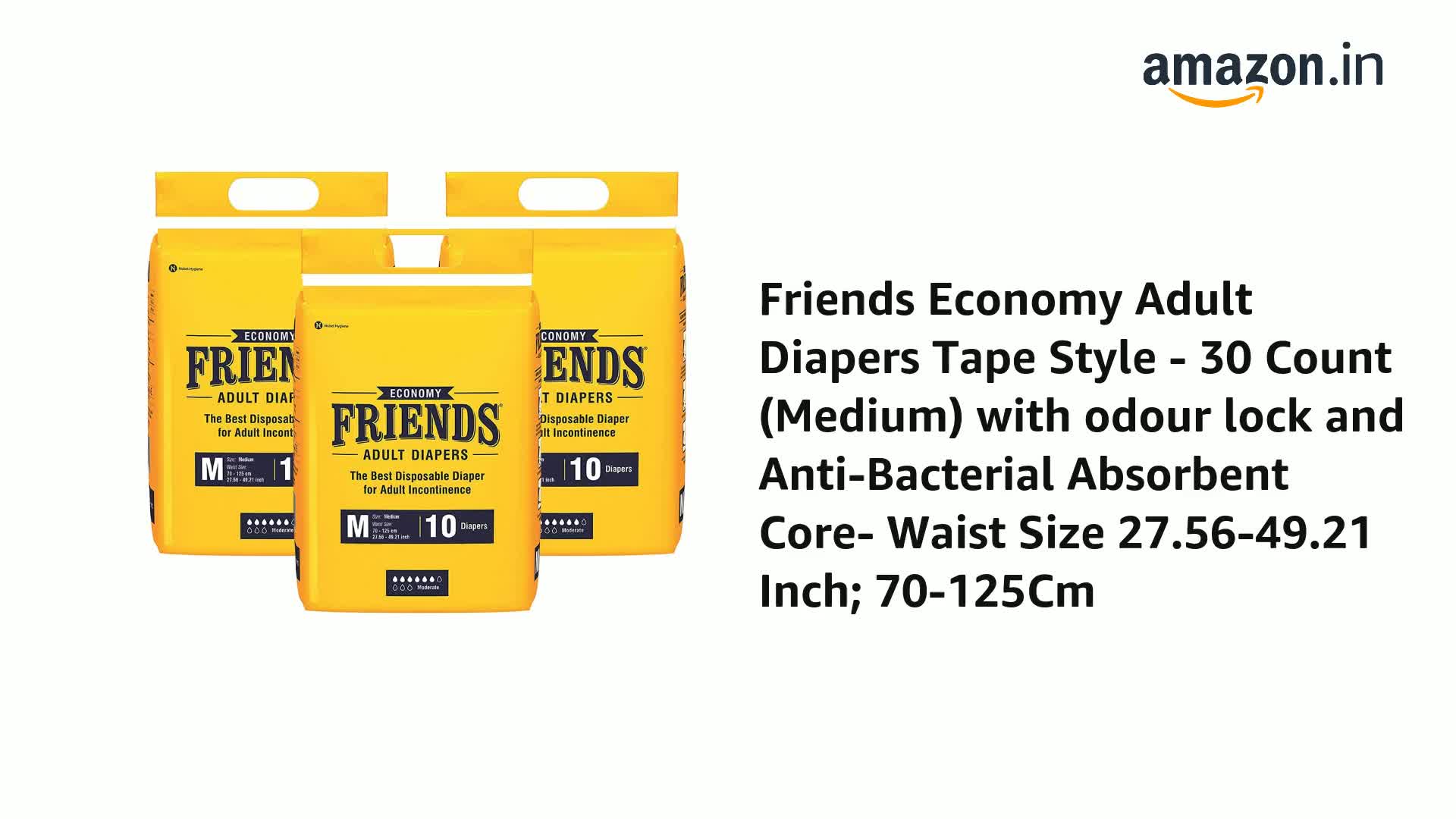 Friends Economy Adult Diapers Tape Style - 30 Count (Medium) with odour lock, Unisex, Leakproof, Wetness Indicator and Anti-Bacterial Absorbent Core - Waist Size 28.35-51.18 inch; 72-130 cm