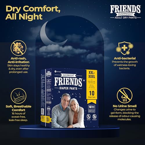 Friends Overnight Adult Diapers Pants Style - 60 Count (Double Extra Large) with odour lock, Unisex, Leakproof, Elastic Waist and Anti-Bacterial Absorbent Core - Waist Size 34-65 Inch; 86-165 cm
