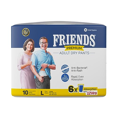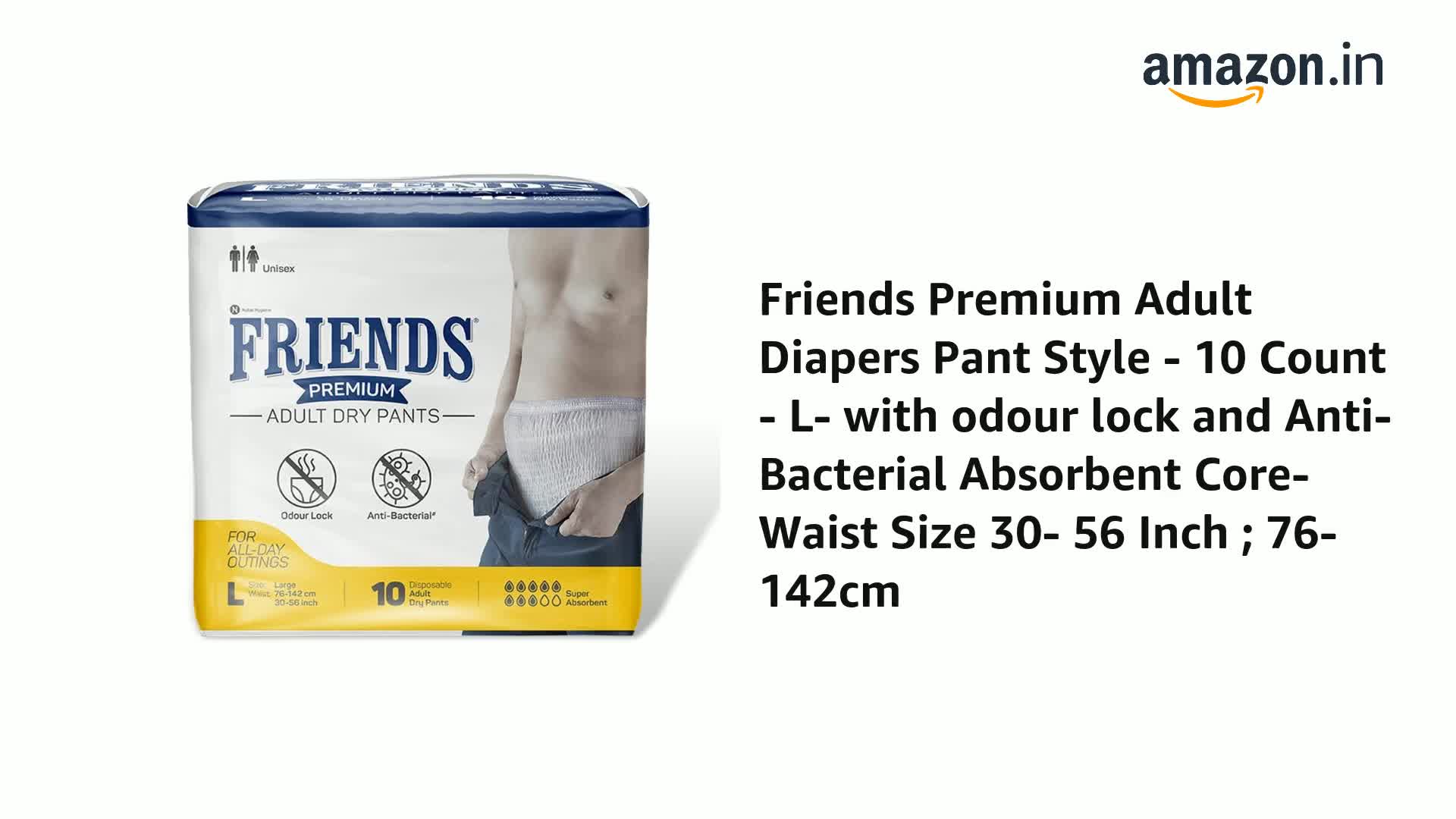 Friends Premium Adult Diapers Pants Style - 10 Count (Large) with odour lock, Unisex, Leakproof, Elastic Waist and Anti-Bacterial Absorbent Core - Waist Size 30-56 inch; 76-142 cm
