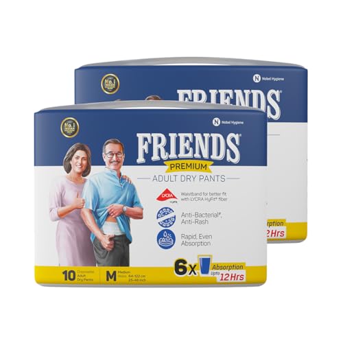 Friends Premium Adult Diapers Pants Style - 20 Count (Medium) with odour lock, Unisex, Leakproof, Elastic Waist and Anti-Bacterial Absorbent Core - Waist Size 25-48 inch; 63.5-122 cm