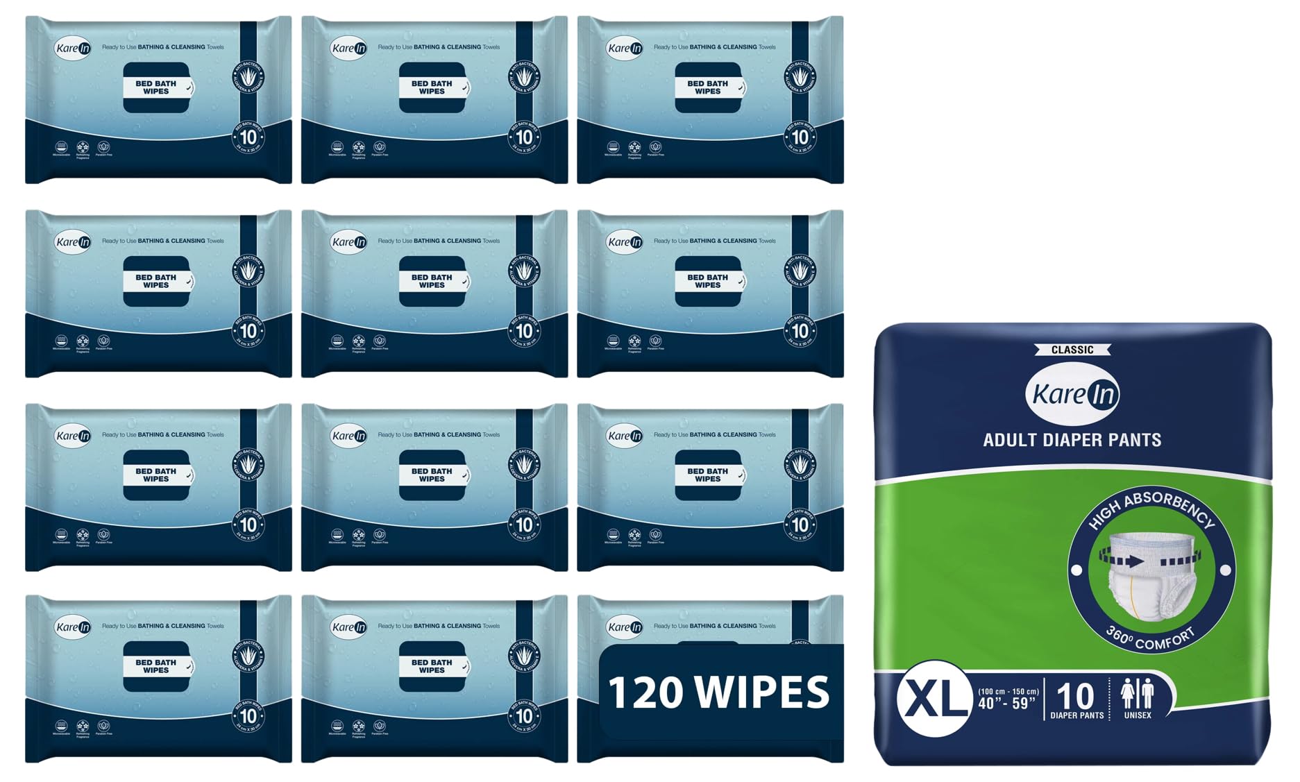 KareIn Bed Bath Wipes, Adult Wet Wipes, 120 Wipes, Pack of 12 & Kareln Classic Adult Diaper Pants, Extra Large 100-150 Cm (40"- 59"), Unisex,Elastic Waist, Wetness Indicator, 10 Count COMBO