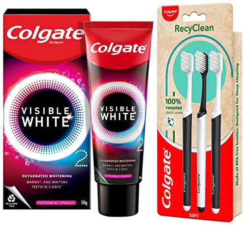 Colgate Visible White O2, Teeth Whitening Toothpaste, Peppermint Sparkle, 50g & Colgate RecyClean Toothbrush, Planet Friendly, Recycled, 3 Pcs
