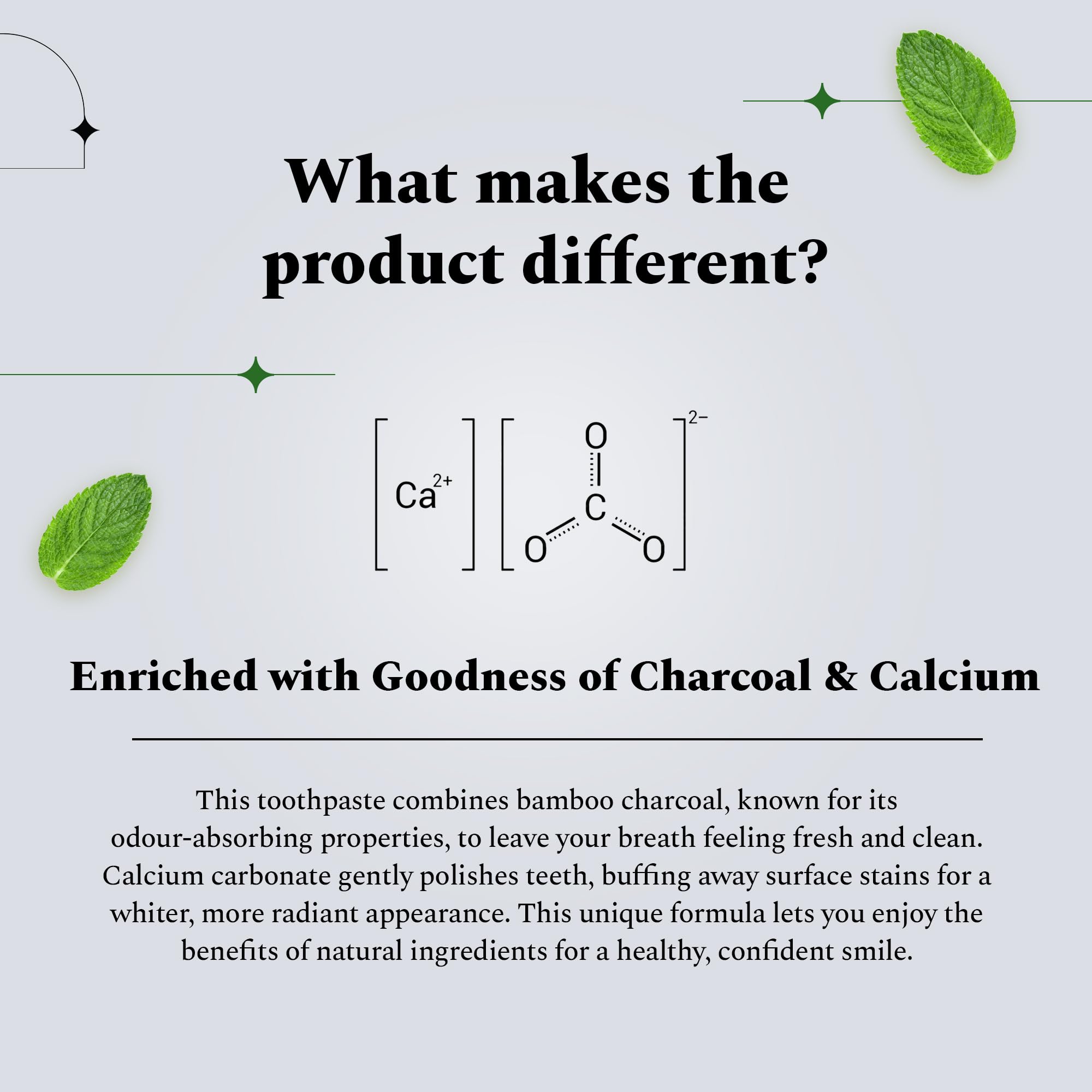 ADVANCED WHITENING FORMULAl Our toothpaste is formulated with Bamboo Charcoal and Calcium Carbonate which work together to deliver advanced whitening benefits. With regular use our toothpaste can help achieve up to 3 times whiter teeth enhancing your smil