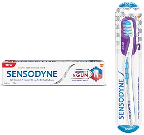 Sensodyne Toothpaste Sensitivity & Gum, Dual action tooth paste for sensitive teeth and healthy gums, 70 gm & Sensodyne Expert Toothbrush With 20X Slimmer & Soft Bristles, 1 Piece (Multicolor)