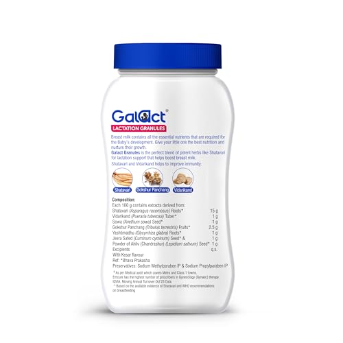 HomeHealth & PersonalPersonal CareWomen WellnessGalact Lactation Supplement for Breastfeeding with Shatavari,Kesar Flavor,200 grams|10-Day Pack|2 Scoops per serving with milk|Galact Granules for Breastfeeding|From Emcure Pharmaceuticals Ltd