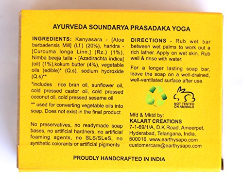 Ingredients:Saponified vegetable edible oils*, fresh aloevera juice, turmeric, neem oil, avocado oil, shea butter*includes rice bran oil, sunflower oil, cold pressed castor oil, cold pressed coconut oil, cold pressed sesame oil