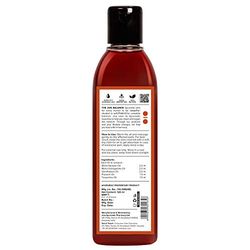 BENEFITS OF FIVE SUPER OILS IN ONE: Jiva Pain Calm Oil combines the goodness of five highly effective Ayurvedic oils - Maha Narayan Oil Maha Vishagarbha Oil Gandhapura oil Parsaraini Oil and Terpentine Oil into one complete rejuvenating pain-relieving sol