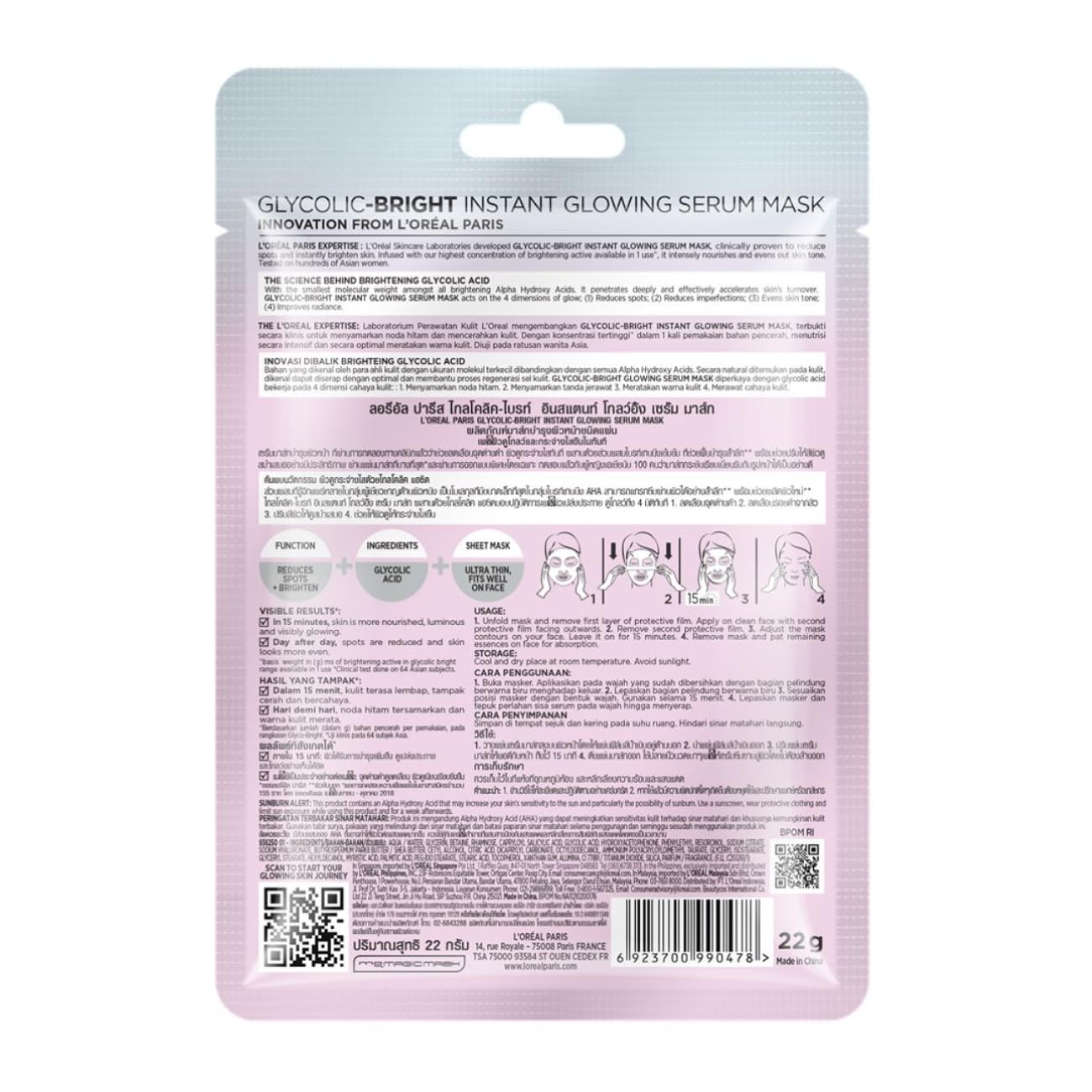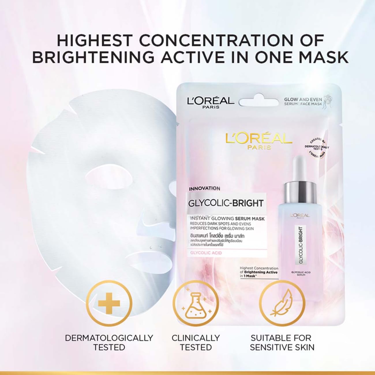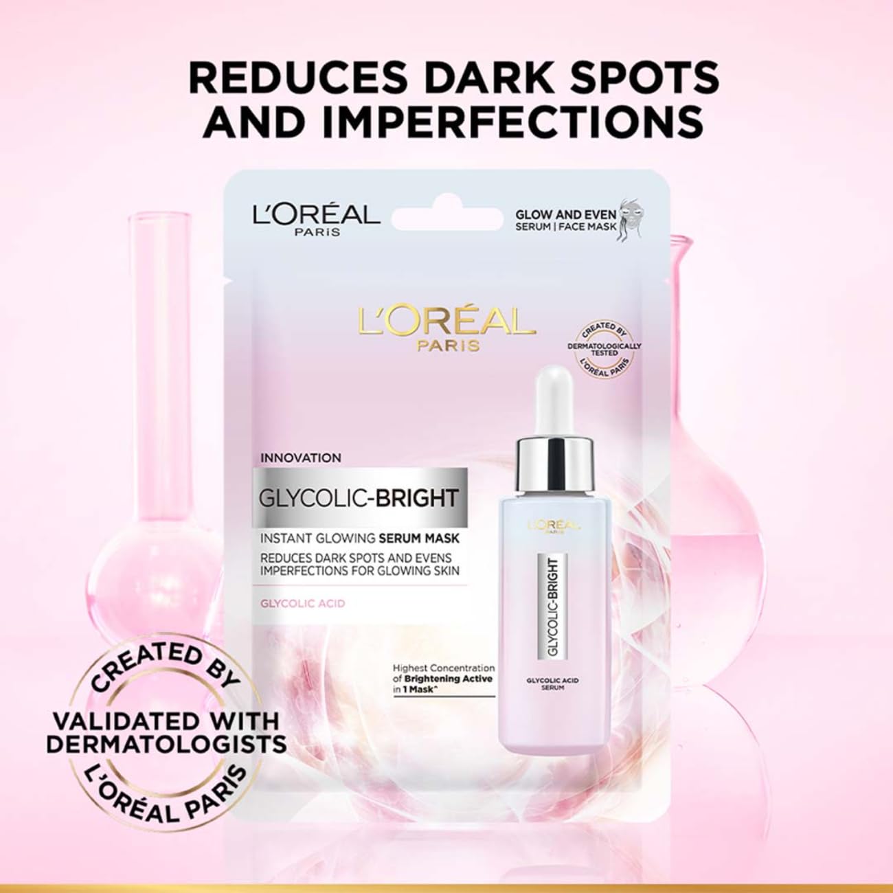 VISIBLE RESULTS: The L'Oreal Glycolic Bright sheet mask helps to achieve visible results in 2 weeks