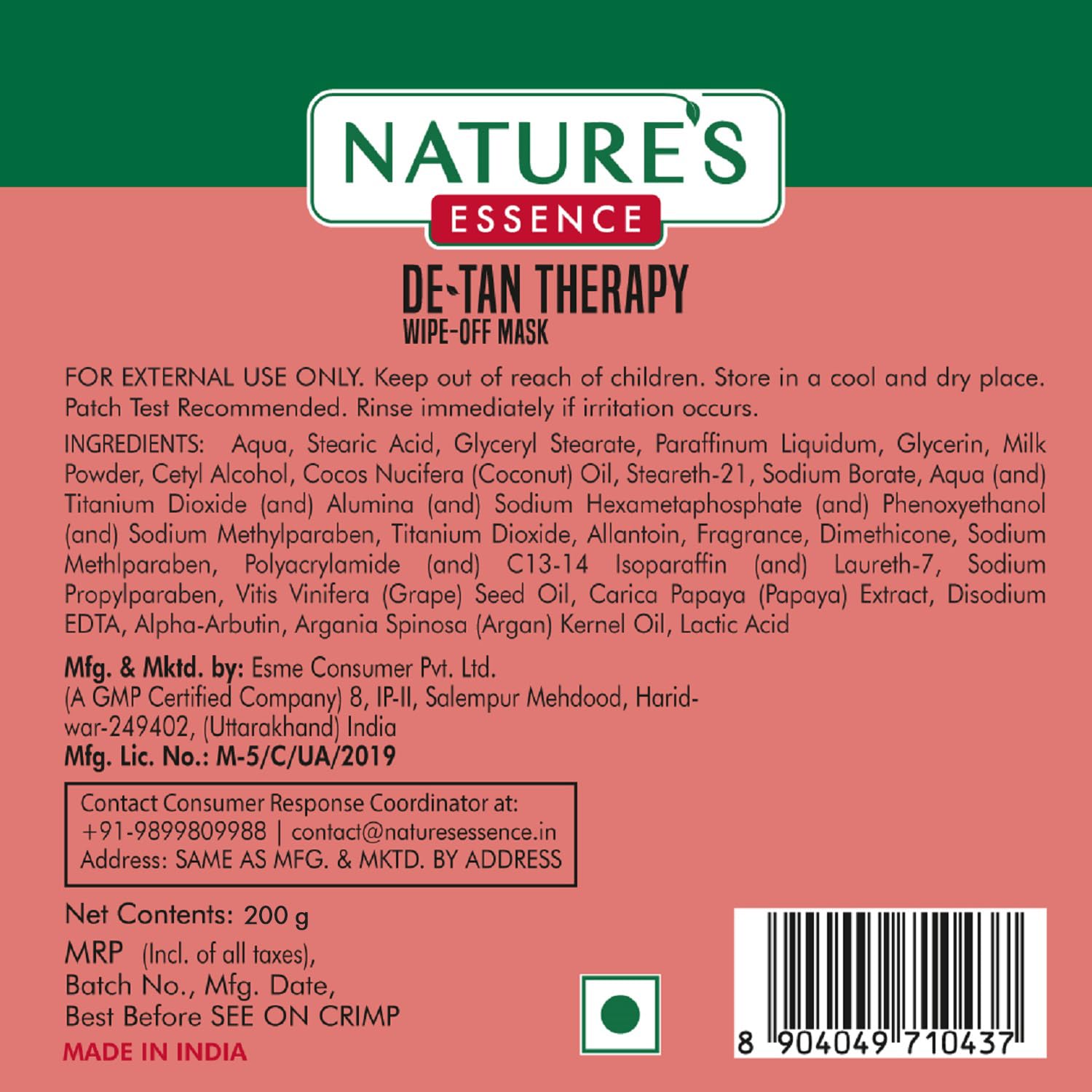 Nature's Essence De Tan Therapy Wipe Off Face Mask| D Tan Face Pack | Brightening Cream for Men & Women | Bleach free formula | Dermatologically Tested | Paraben-Free | 200gm