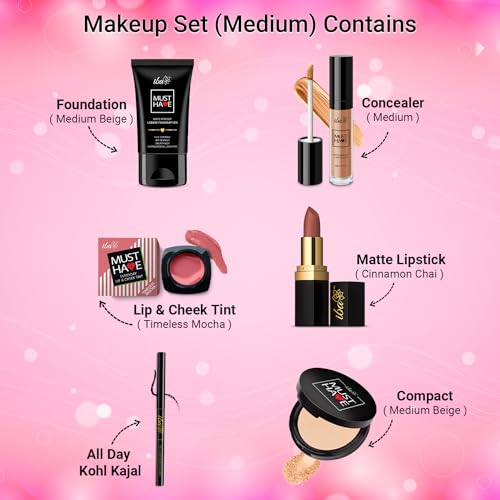 HomeHealth & PersonalSkin CareLip CareLipsticksIba Must Have Makeup Set (Medium) | Gifts for Women | Waterproof Foundation, Concealer, Matte Compact, Lip & Cheek Tint, Matte Lipstick, Smudge Proof Kajal | Makeup Kit for Women