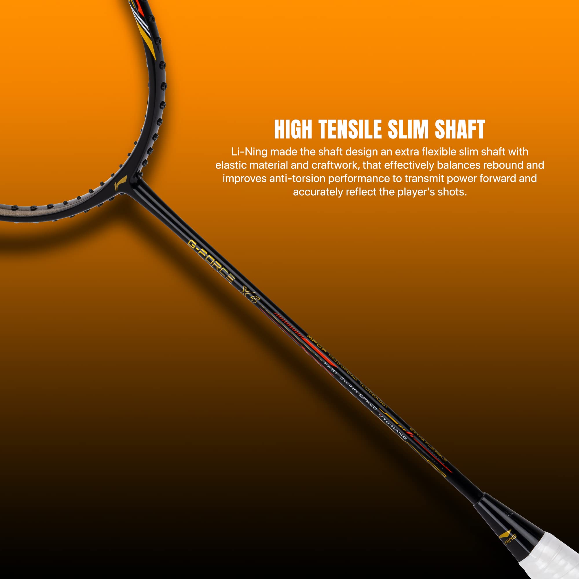 High Tensile Slim Shaft: Li-Ning made the shaft design an extra flexible slim shaft with elastic material and craftwork that effectively balances rebound and improves anti-torsion performance to transmit power forward and accurately reflect the player's s