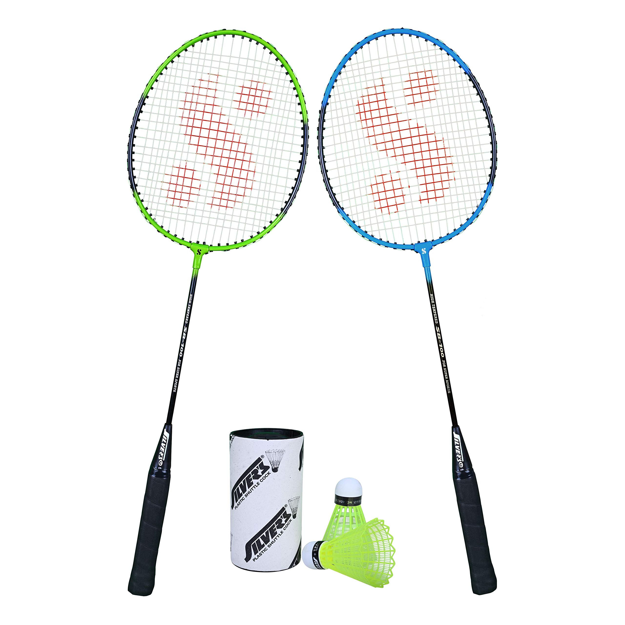 Silver's SB-100 Combo-2 (2 B/Badminton Rackets with 1 Full Cover + 2 Pcs Plastic Shuttle) Green-Blue Steel & Silver's Kids SIL-Pedal Combo-4 Aluminum Badminton Racquet Pack of 2
