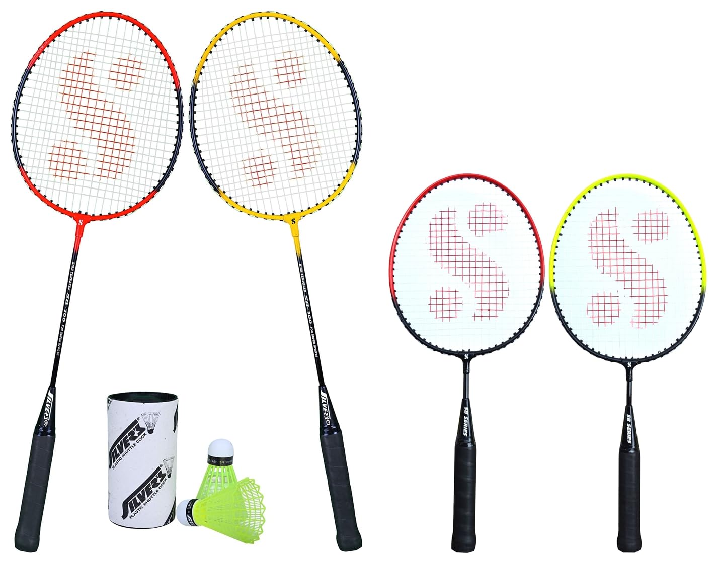 Silver's SB-100 Combo-5 (2 Badminton Rackets + 2 Pcs Plastic Shuttle) Red-Yellow & Silver's Kids SIL-Pedal Combo-4 Aluminum Badminton Racquet Pack of 2