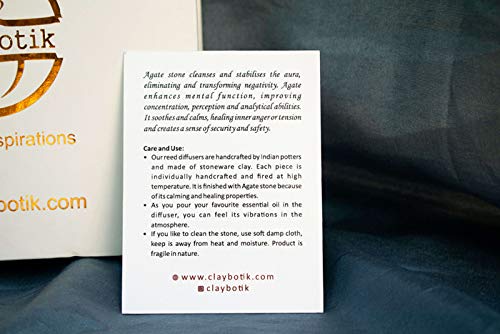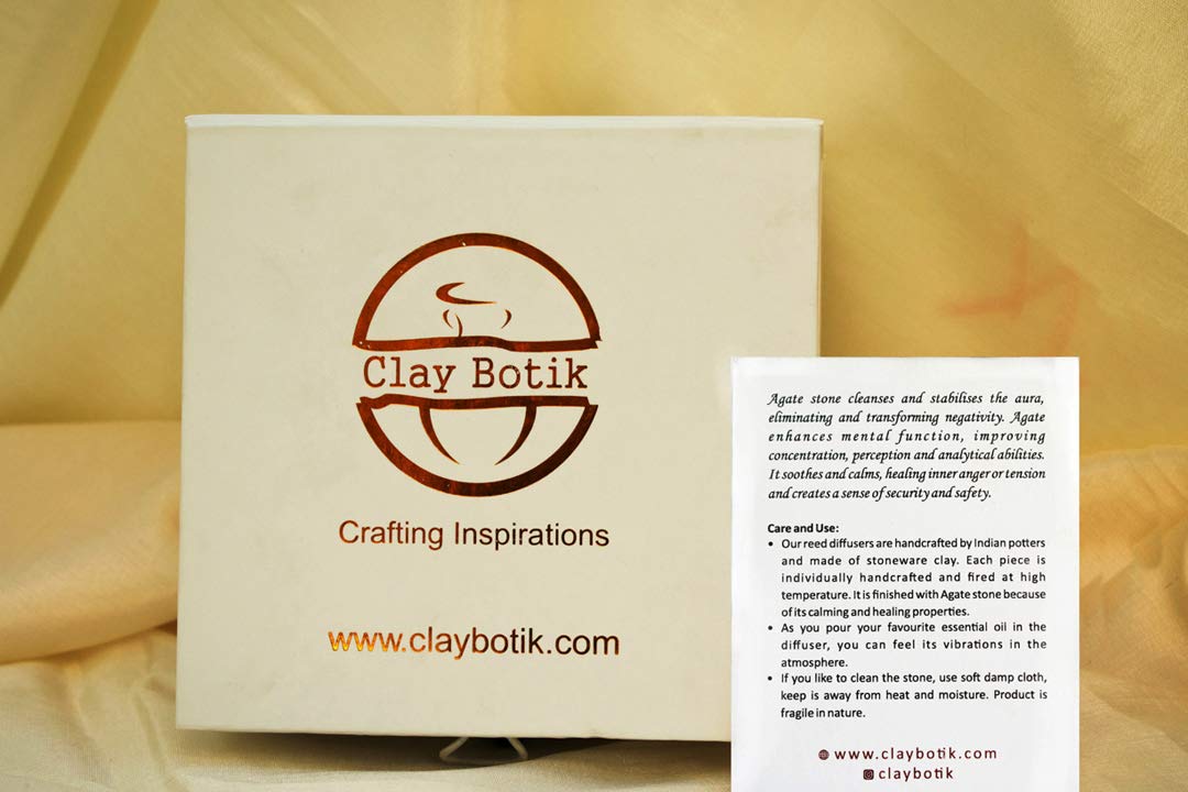 Our reed diffusers are handcrafted by Indian potters and made of stoneware clay. Each piece is individually handcrafted and fired at high temperature. It is finished with Agate stone because of its calming and healing properties.