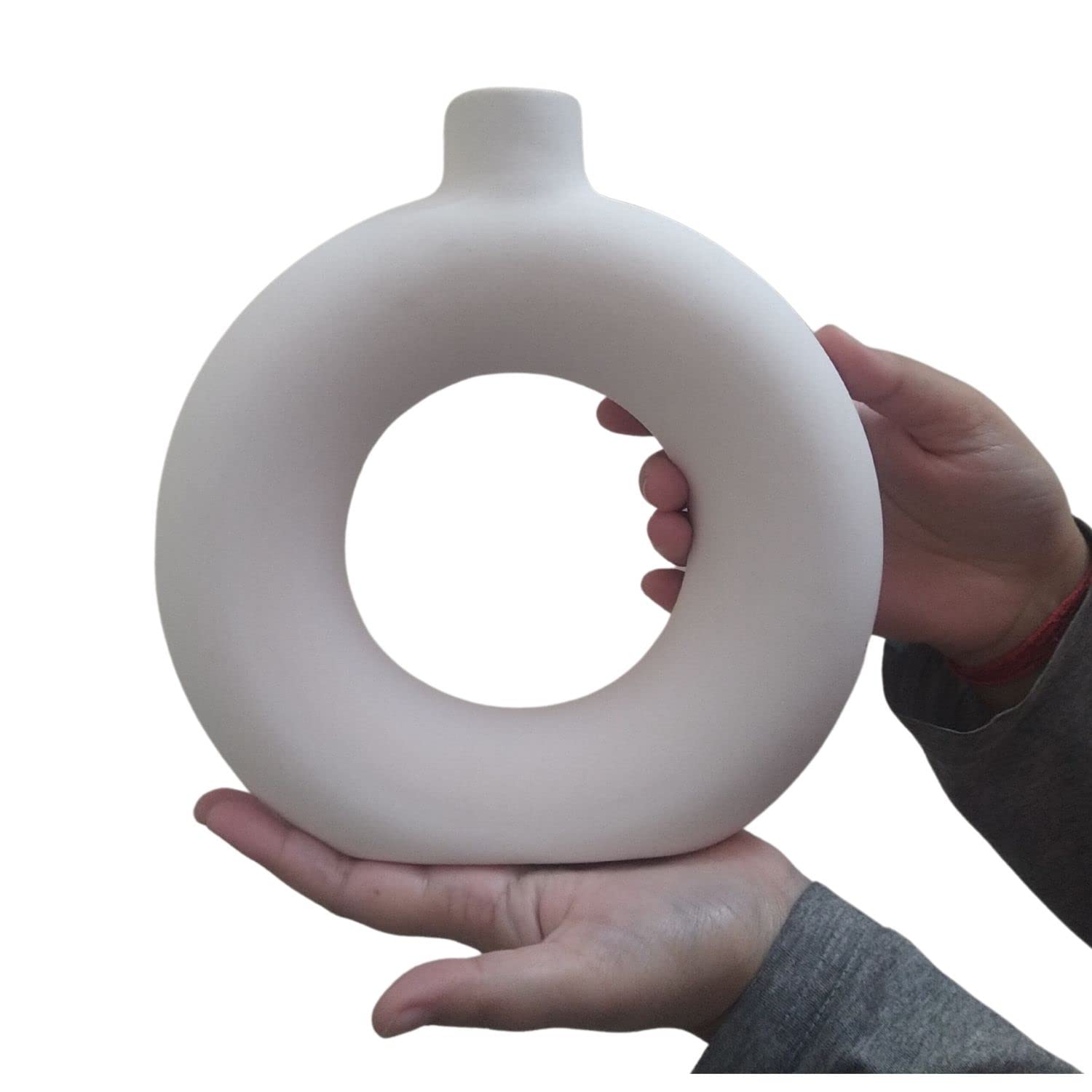KHURJA POTTERY Donut Vase | White Vase | Flower Vase | Pampas Grass Vase | Ceramic Vase | Round Shaped Vase | Donut White Ceramic Pot and Vase Handcrafted 8 Inch