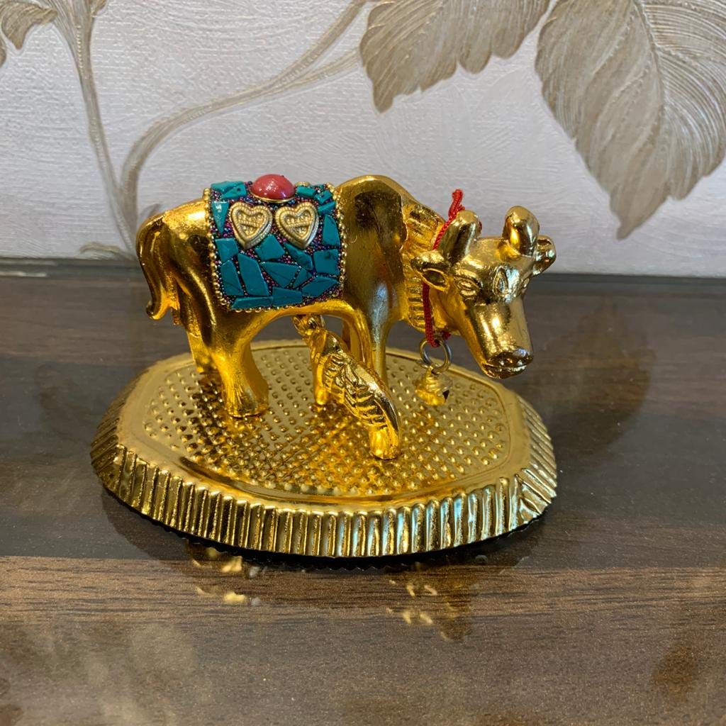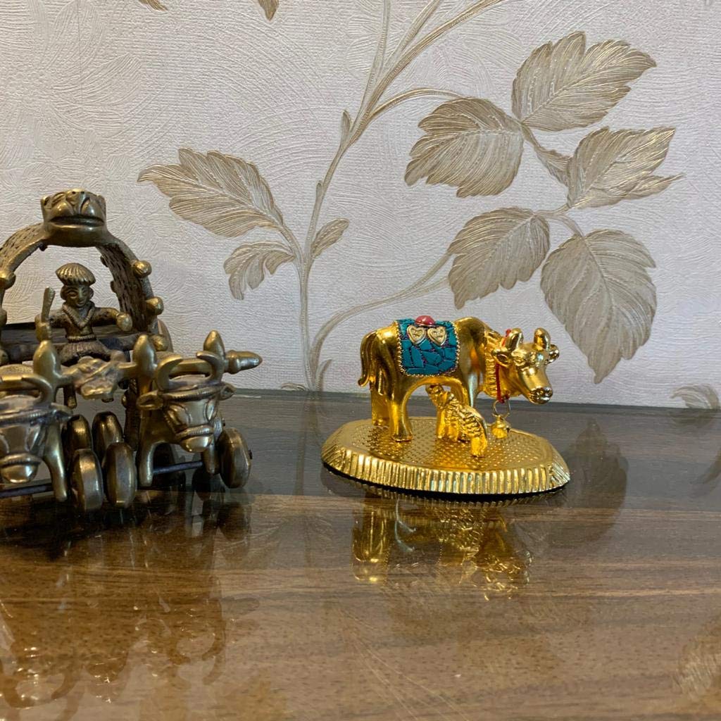Metal Golden Kamdhenu Cow and Calf Statue for Home Decor and Gift (L X W X H) : 3.5 x 2.5 x 2.5 Inch