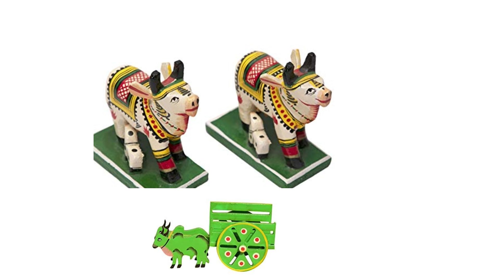 VARANASI WOODEN TOYS Wooden Handcrafted Kamdhenu-Nandini Pair Cow -Calf Golu with Bullock Cart for Pongal- Sankranti Decor: Showpiece & Gift Item