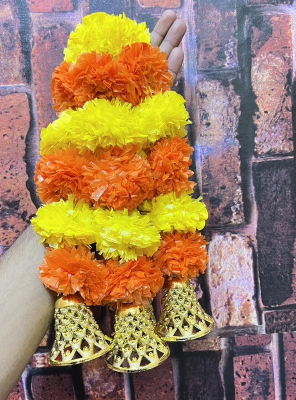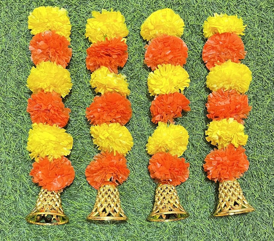 Festive Vibes 4 Pieces Artificial Marigold Flowers and Golden Hanging Bells Short/Torans/Wall hangings/Latkans for mandir Decoration/Diwali Decoration Backdrop dcor Approx 1.2 ft