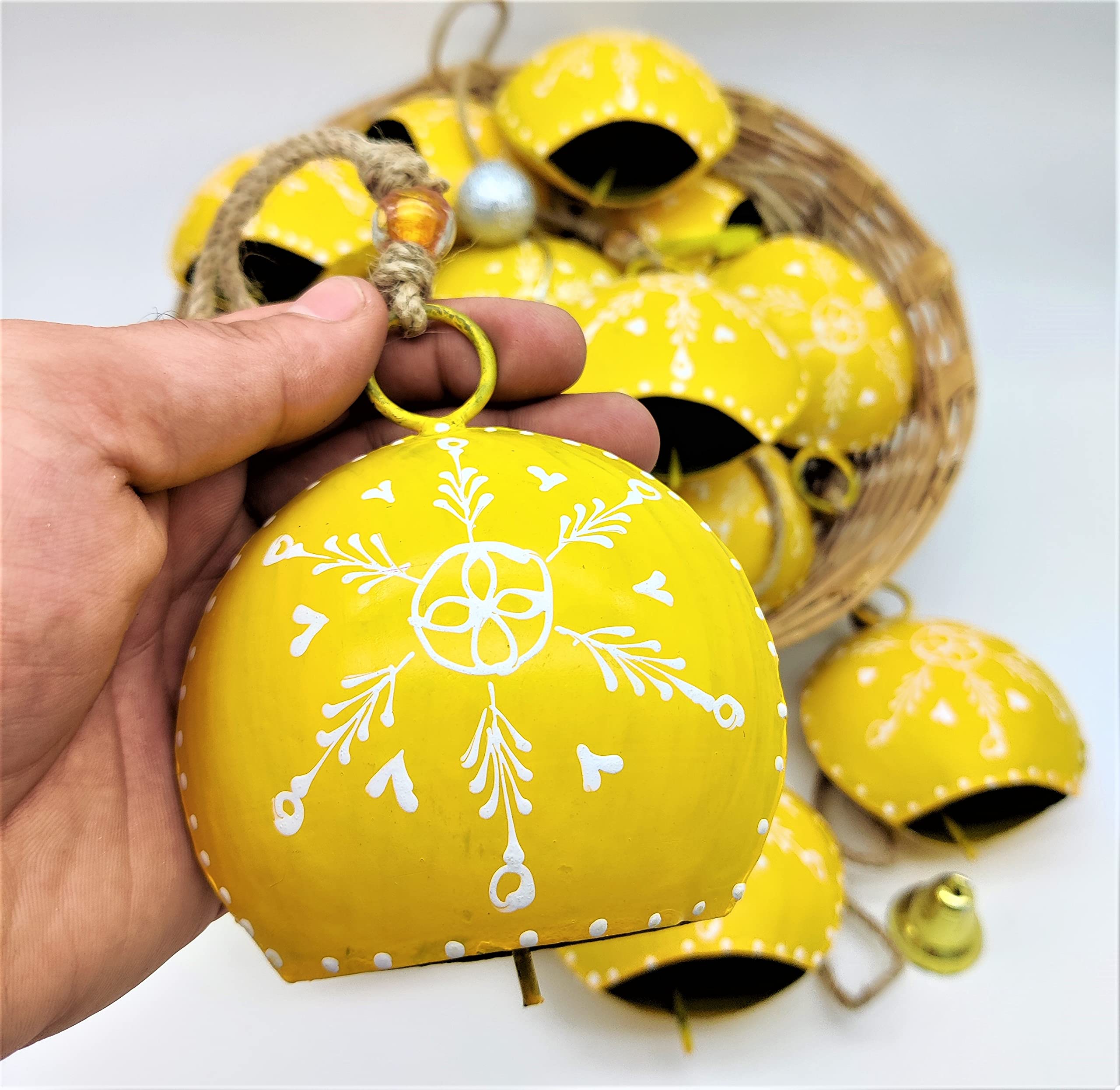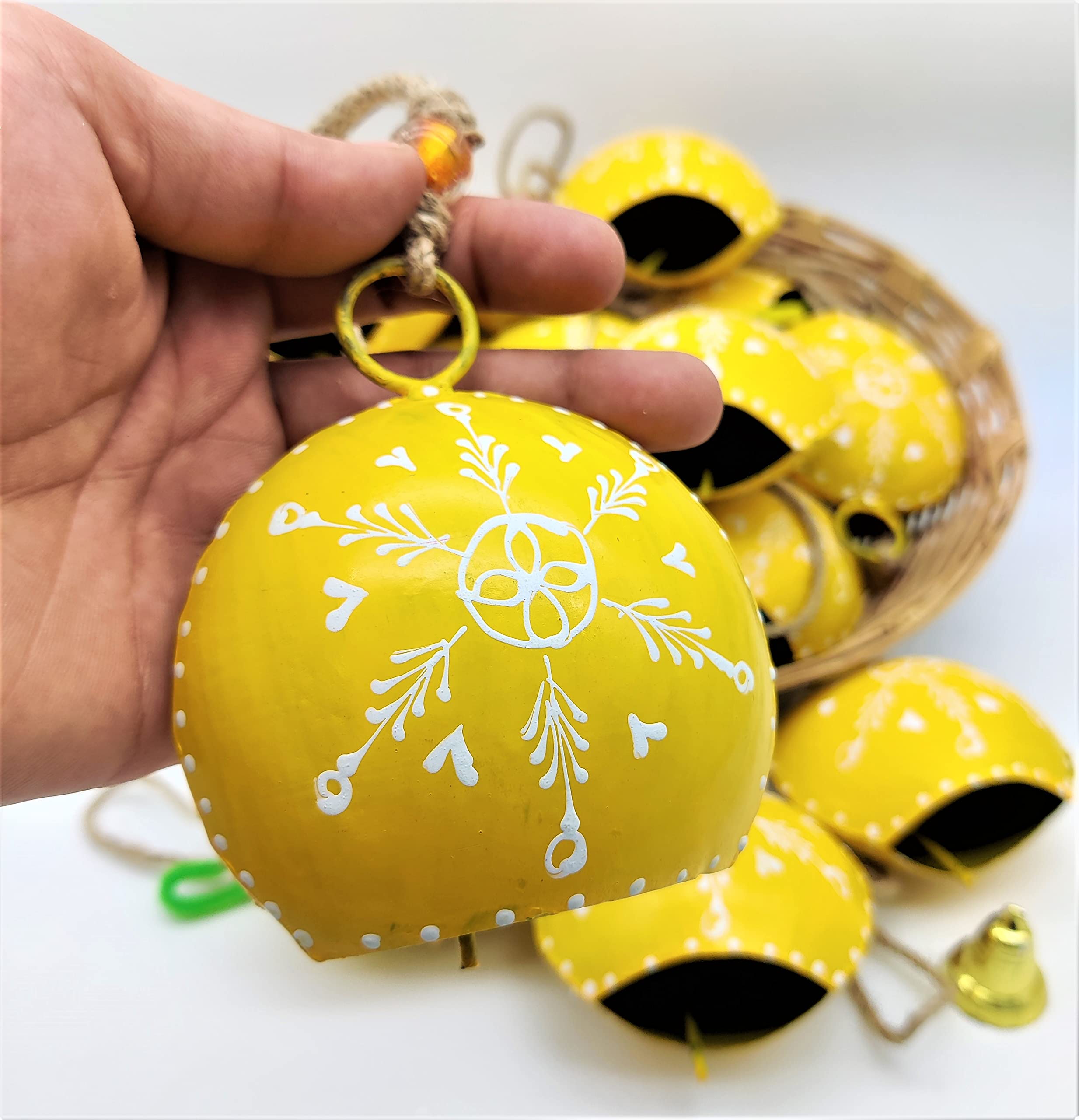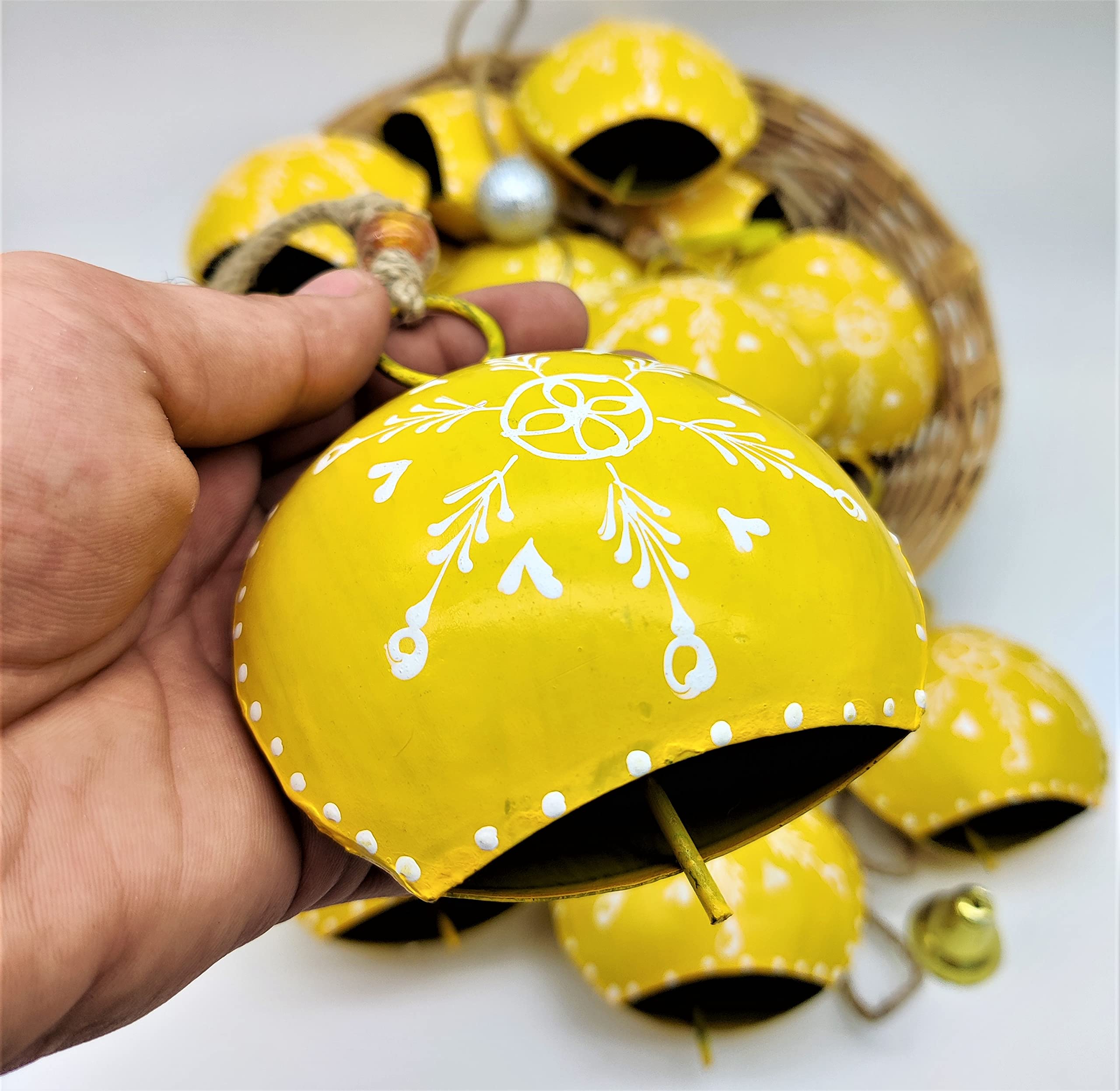 HomeHomeSpiritualBellsBEHAT BRASS WIND CHIMES - HANGING BELLS Big Hand Painted Tin Hanging Bells with Hand Painted Jute Bag for festive decoration (Yellow 10cm) Set of 10
