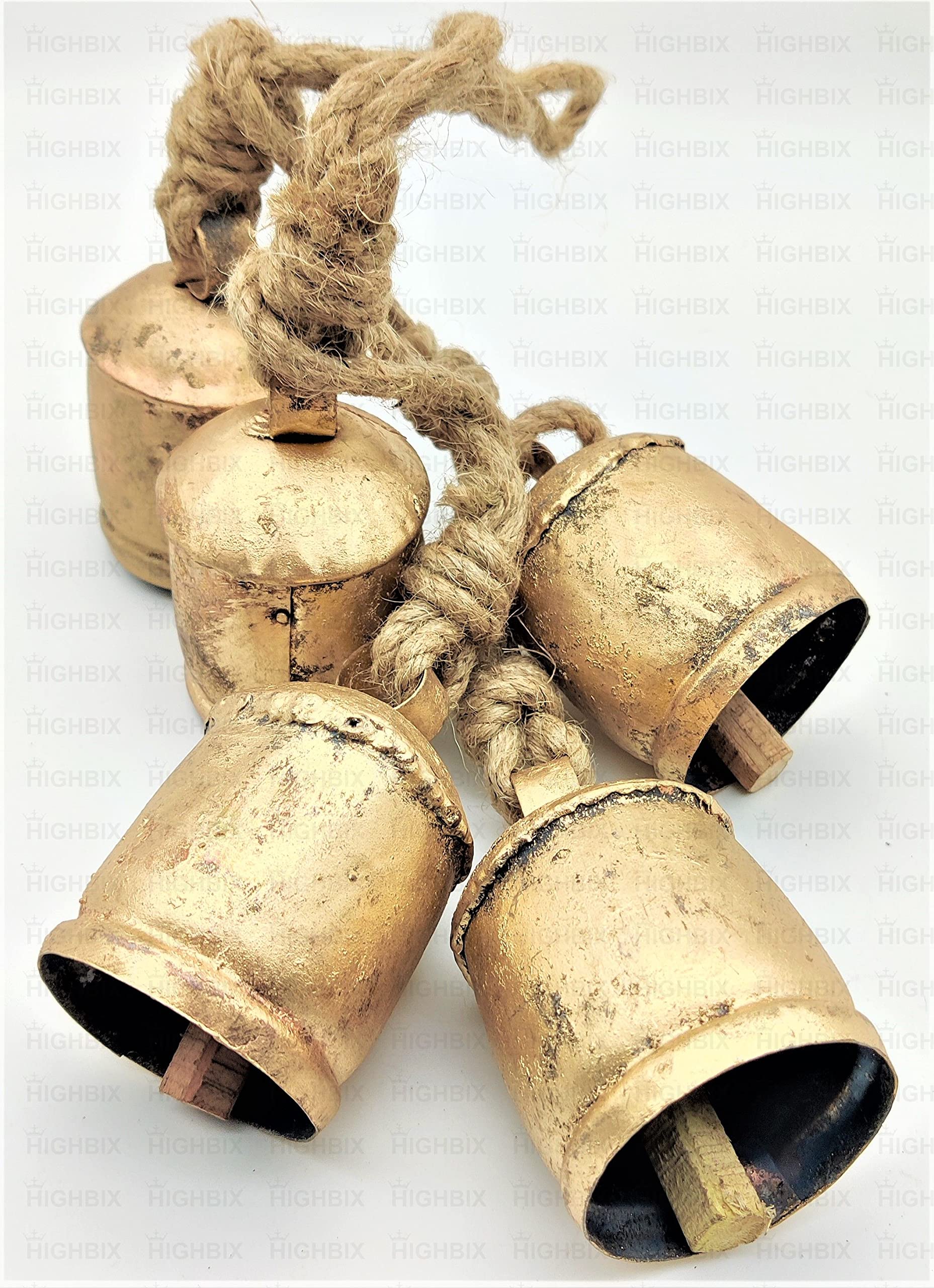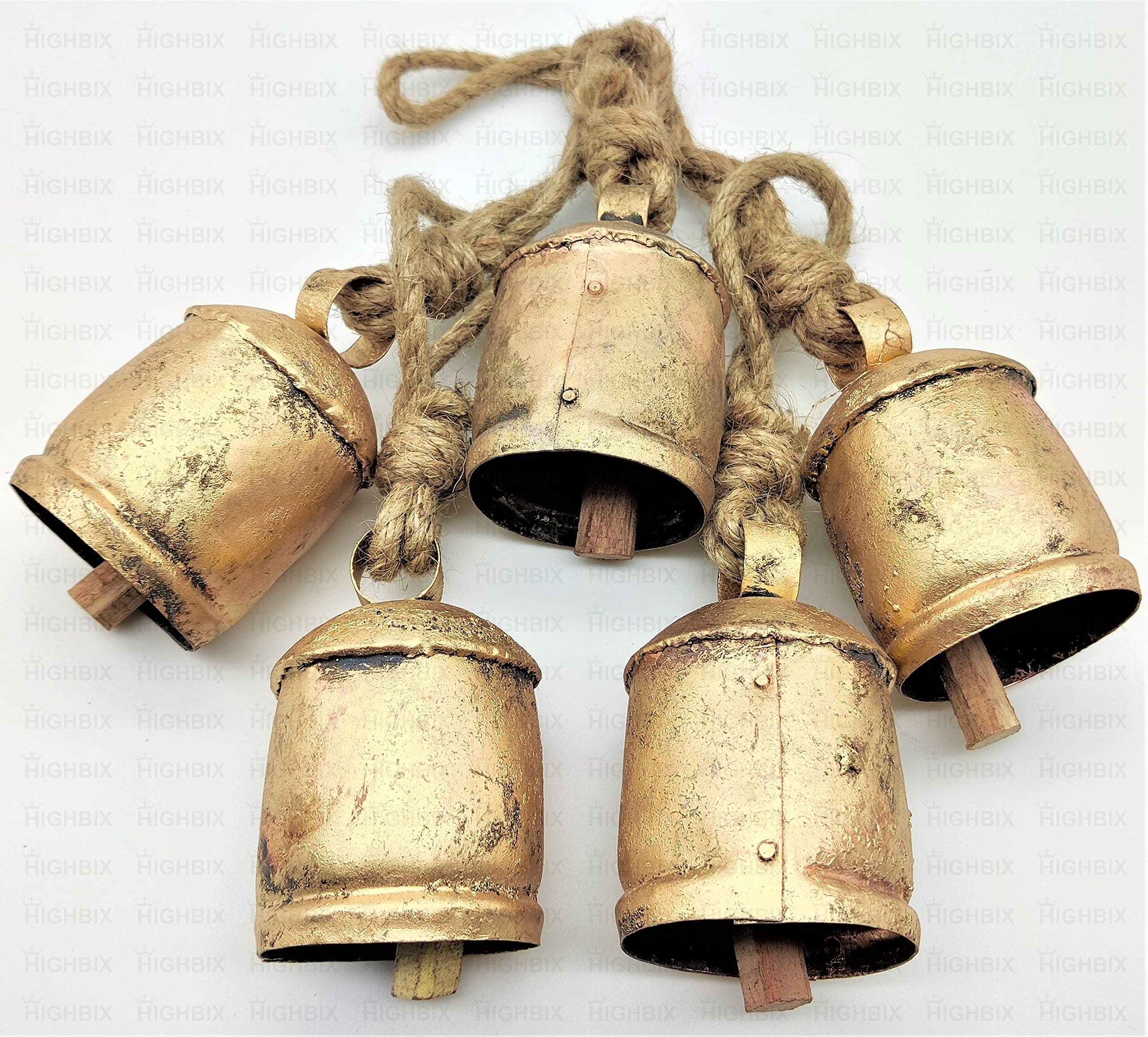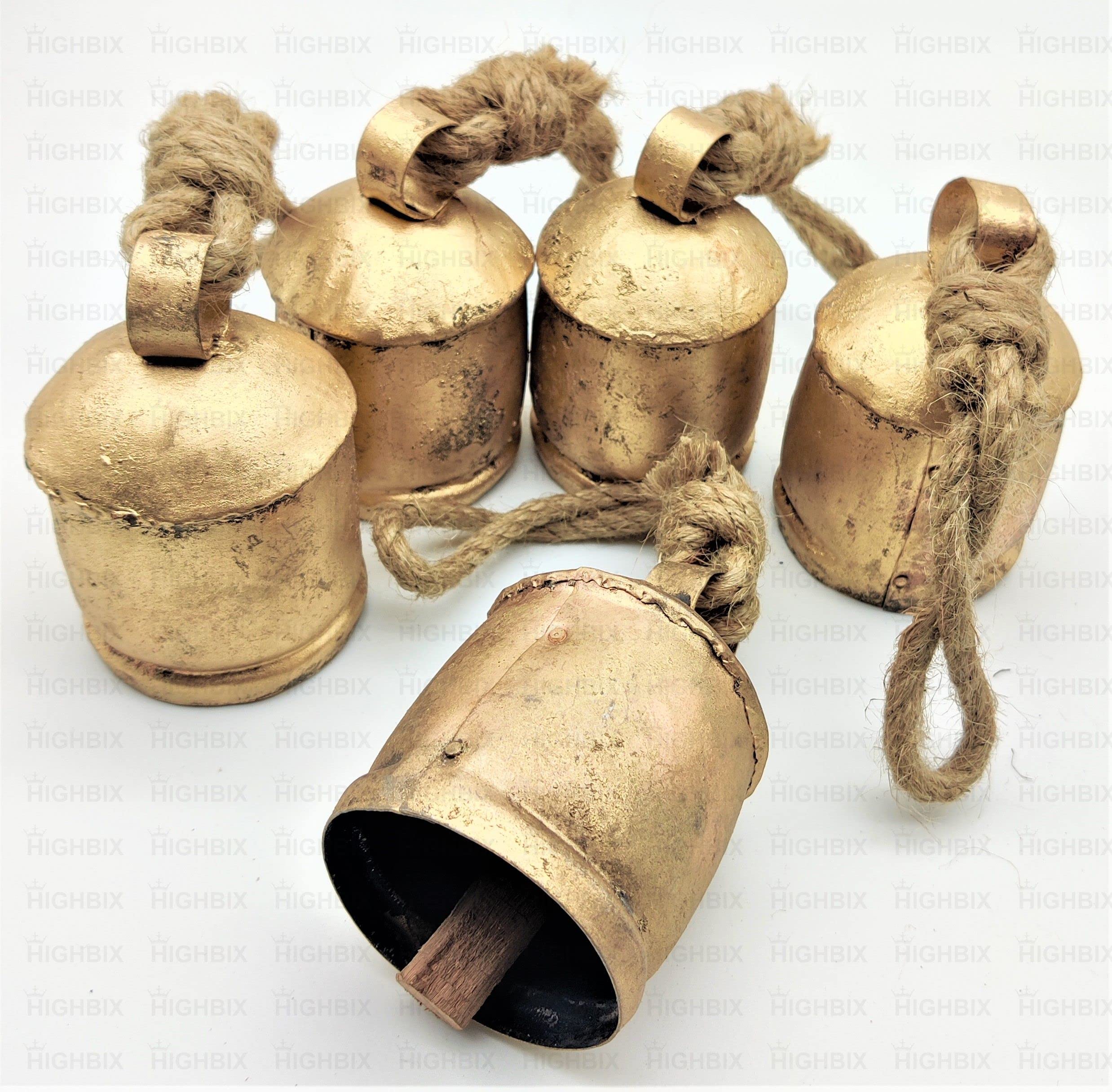 HomeHomeSpiritualBellsBEHAT BRASS WIND CHIMES - HANGING BELLS Vintage Rustic Tin Metal Cow Bells Set of 5 Wall Hanging Dcor Big 10cm Rustic Handmade Bells On Jute Rope