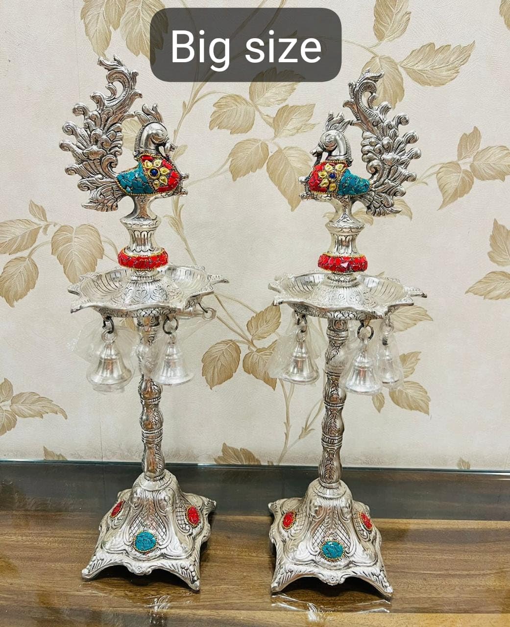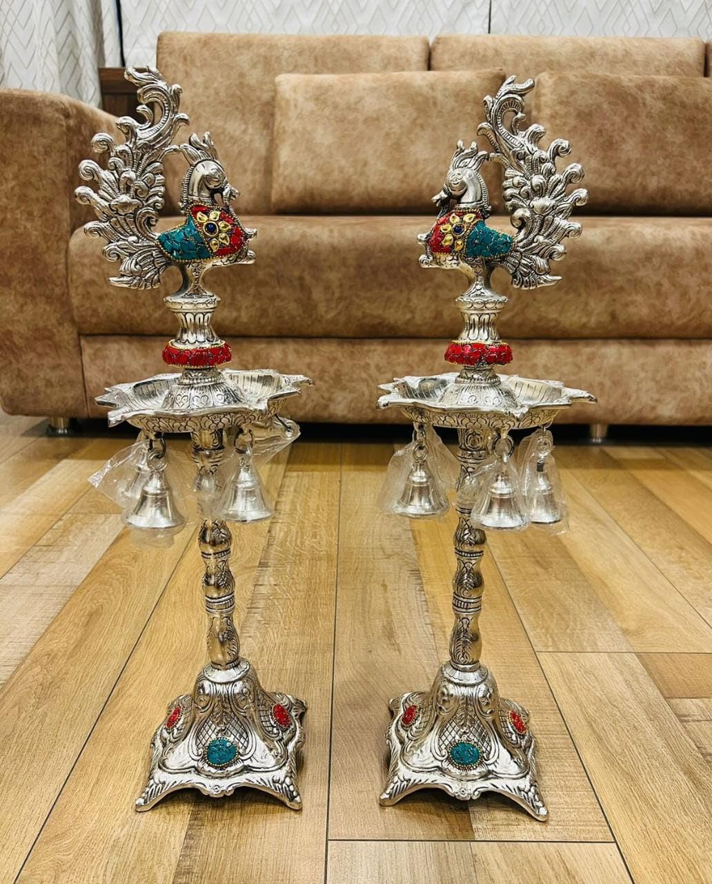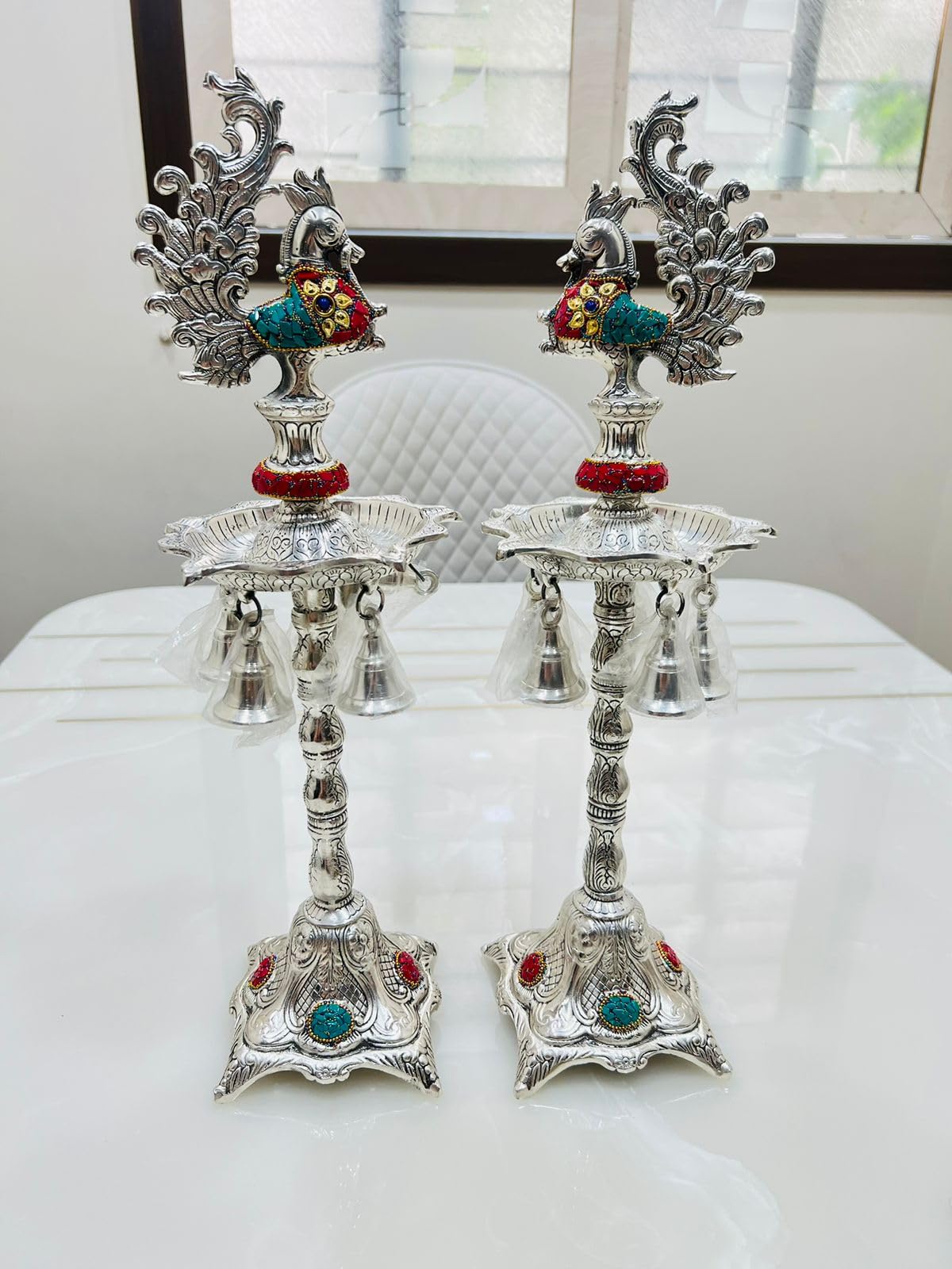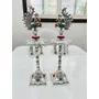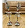 HomeHomeSpiritualEco-Friendly DiyaGerman Silver Hand Engraved Peacock Samai Pair / Diya Stand Pair with Semi Precious Stone Carving Work for Decoration & Gifts - Pack of 2 (Size - 21 x 7 Inch)