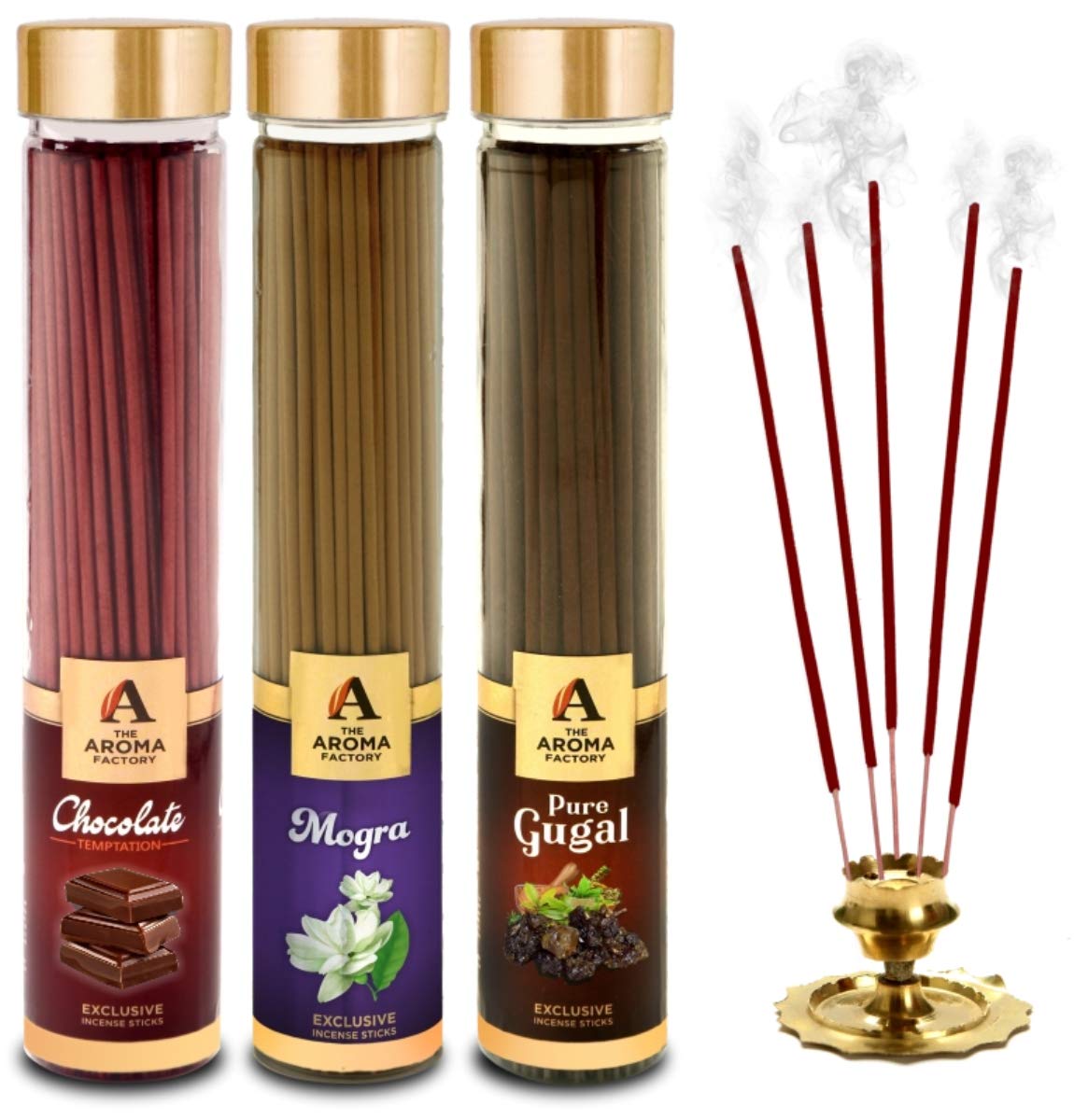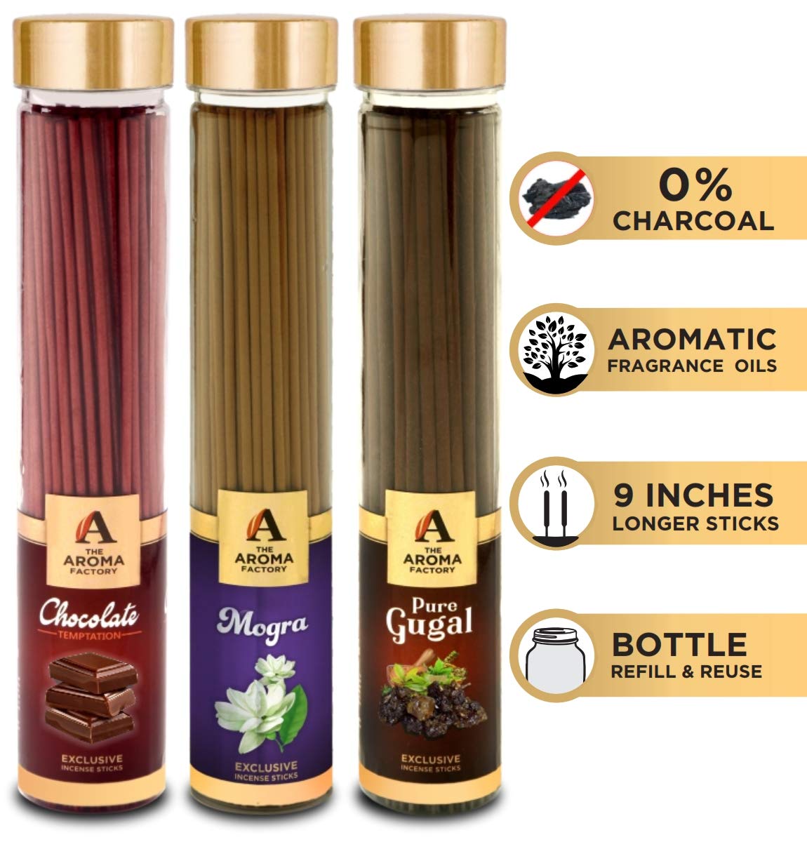 The Aroma Factory Organic ChocolateMogra & Gugal Agarbatti for Pooja No Charcoal Incense Sticks100% Herbal Fragrance Agarbathi (Bottle Pack of 3x100g)