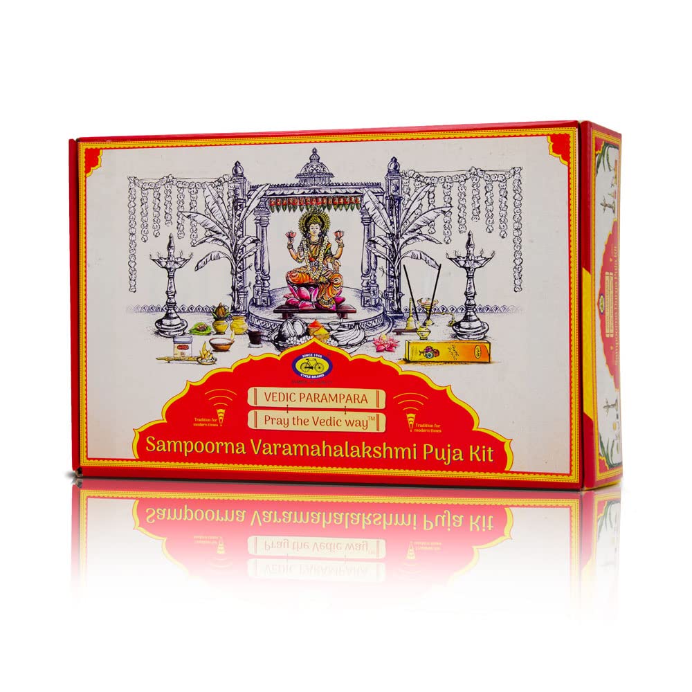 Pack contains a Varamahalakshmi idol Varamahalakshmi Mukhavada prayer essentials pooja items and step-by-step instruction